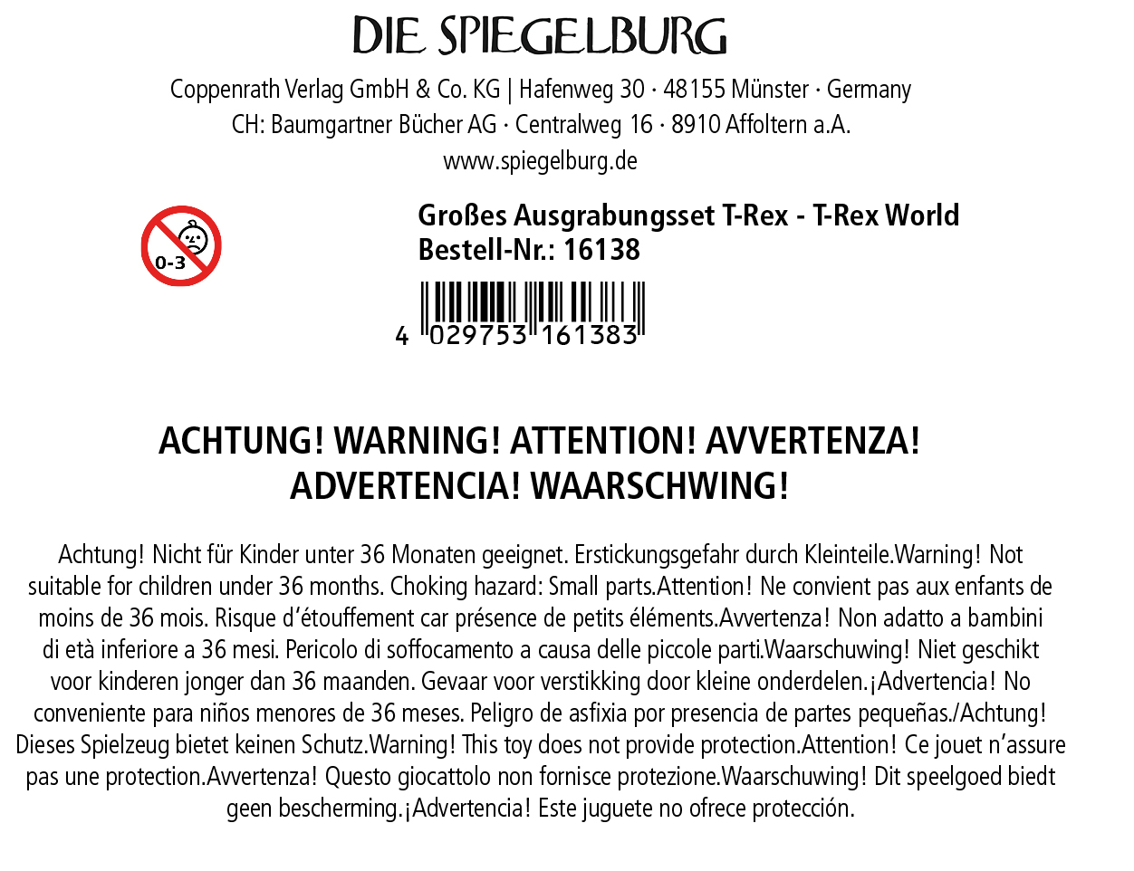 Spannendes Ausgrabungsset mit 11-teiligem Skelett im Gipsblock von einem faszinierenden T-Rex. Dazu Metall-Hammer und Spatel, Pinsel sowie eine Schutzbrille.
