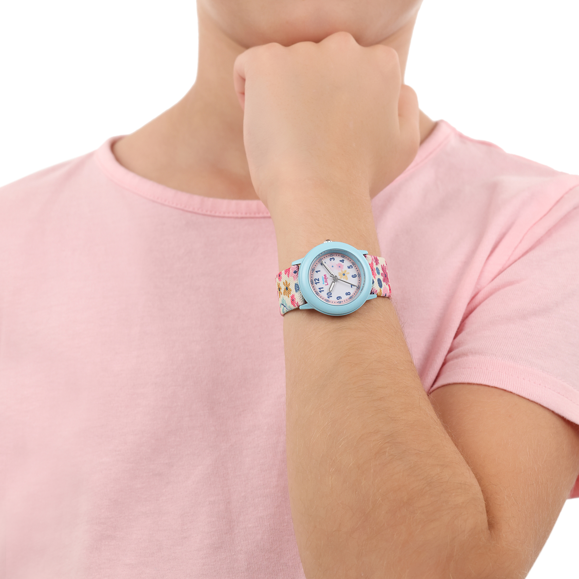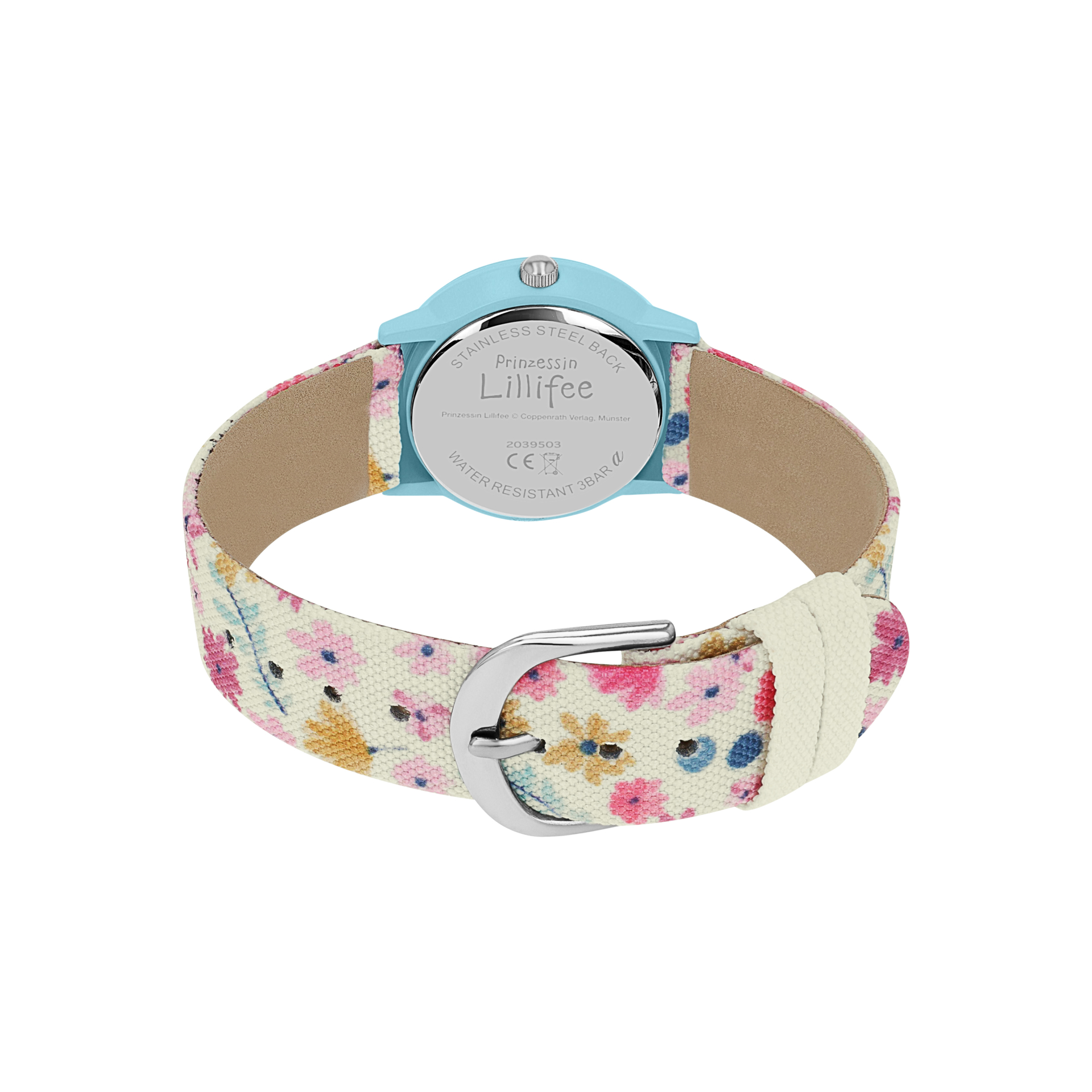 Prinzessin Lillifee Mädchen Uhr der Schmuckmarke Amor. Das matt gestaltete Gehäuse besteht aus hochwertigem Alloy und ist mit einem blauen Farbspray veredelt. Die Krone ist aus Edelstahl. Das längenverstellbare Textilarmband mit Tier- und Naturmotiven überzeugt durch die einfache Handhabe der Dornschließe. Das kratzfeste Mineralglas schützt das Ziffernblatt, das die Zahlen deutlich inklusive Sekunden dazwischen anzeigt. Ein präzises Citizen Miyota Uhrwerk ist bis auf drei Bar wasserdicht und somit spritzwassergeschützt.