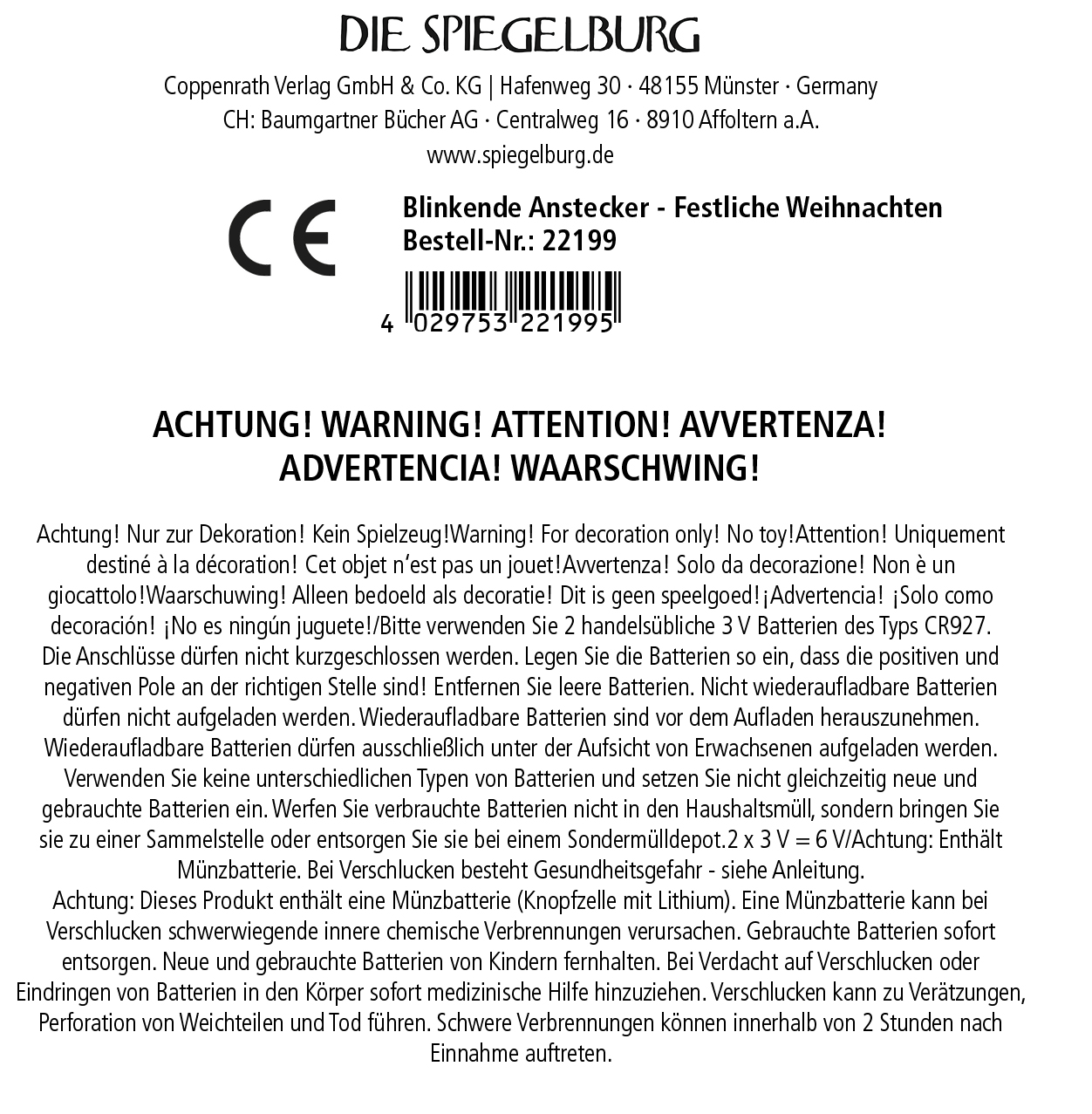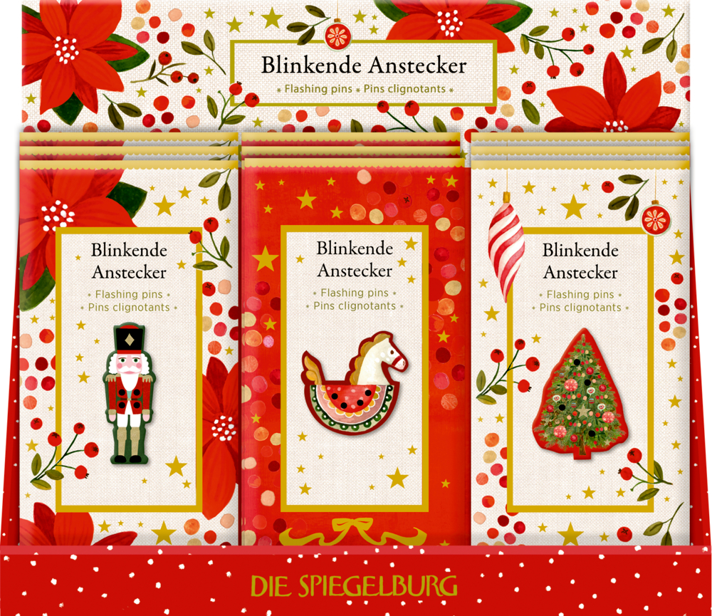 Dieser kleine Anstecker blinkt fröhlich und ist ein lustiges Accessoire zum Anstecken an Mütze, Jacke oder Krawatte. Mit je 4 LED macht der Anstecker jedes Outfit zum strahlenden Hingucker. Eine lustige Idee für die Weihnachtsfeier, den Ausflug zum Weihnachtsmarkt oder die nächste Familienfeier. Ein zauberhaftes Mitbringsel - für festliche Weihnachten. Erhältlich in 3 Designs.