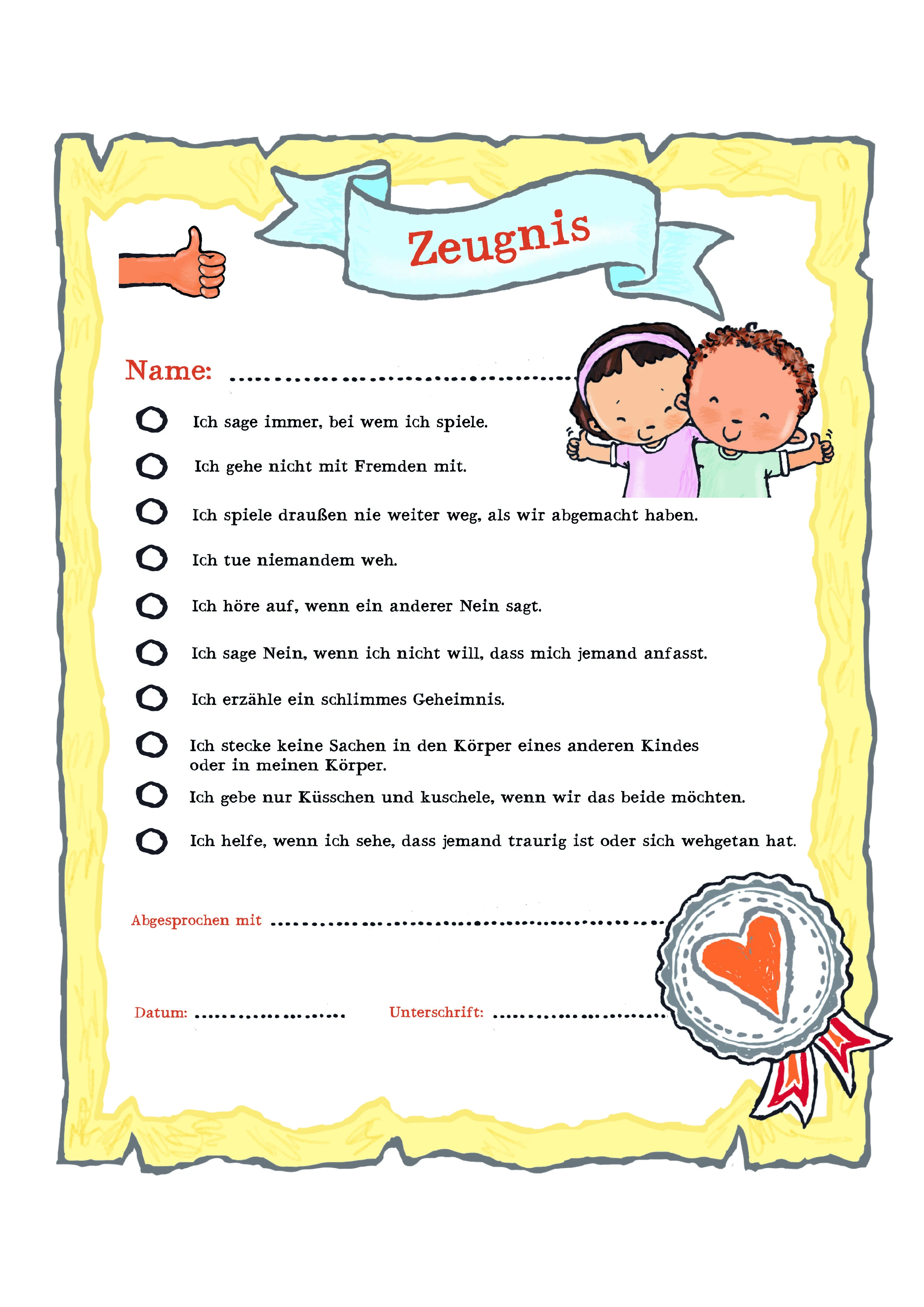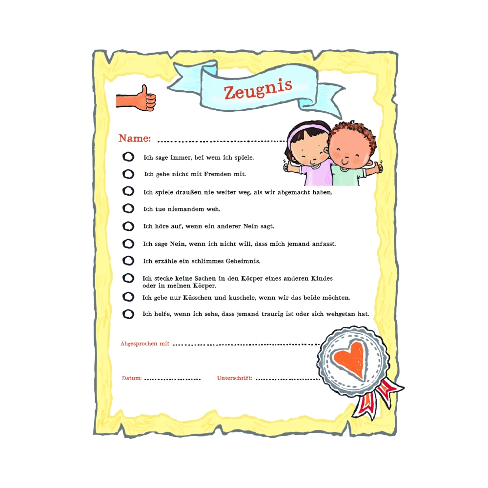 Ja und Nein zu sagen, manchmal ist das gar nicht so einfach. Und auch die Grenzen der anderen zu akzeptieren, fällt nicht immer leicht. Darum können Sie mit Ihren Kindern, genau wie Toms Eltern im Bilderbuch „Ja & Nein – ich sag, was ich (nicht) mag“, ein Absprachen-Zeugnis ausfüllen. Dort sind die wichtigsten Regeln für einen achtsamen Umgang miteinander festgehalten. Denn Regeln sorgen für Klarheit und geben den Kindern so Sicherheit.