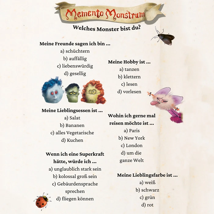 Beantworte jede Frage aus dem Bauch heraus und notiere (oder merke) dir, welcher Buchstaben am Anfang deiner Antwort steht. Der Buchstabe, den du am meisten hast, ergibt am Schluss dein Monster.
