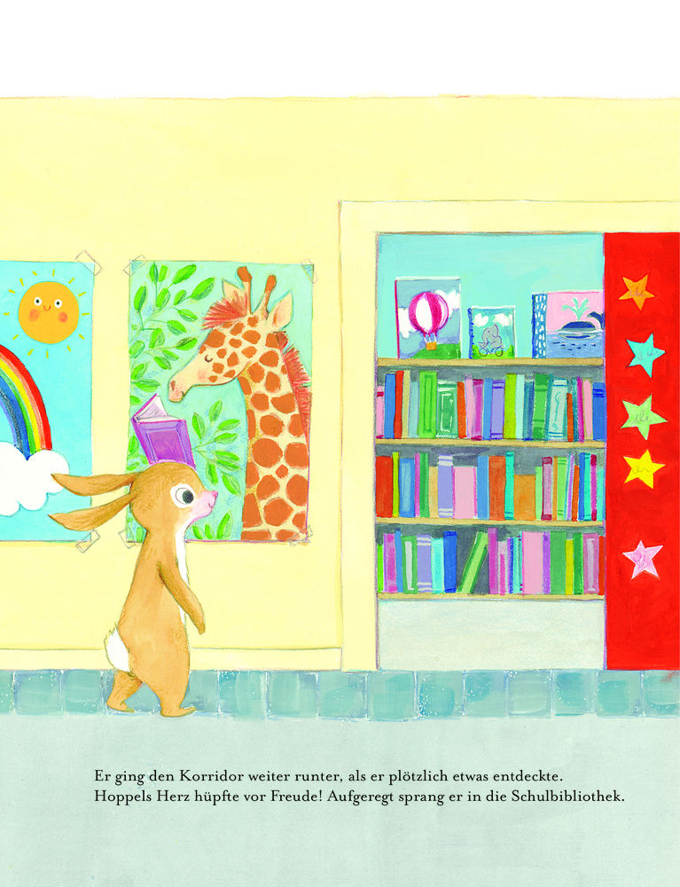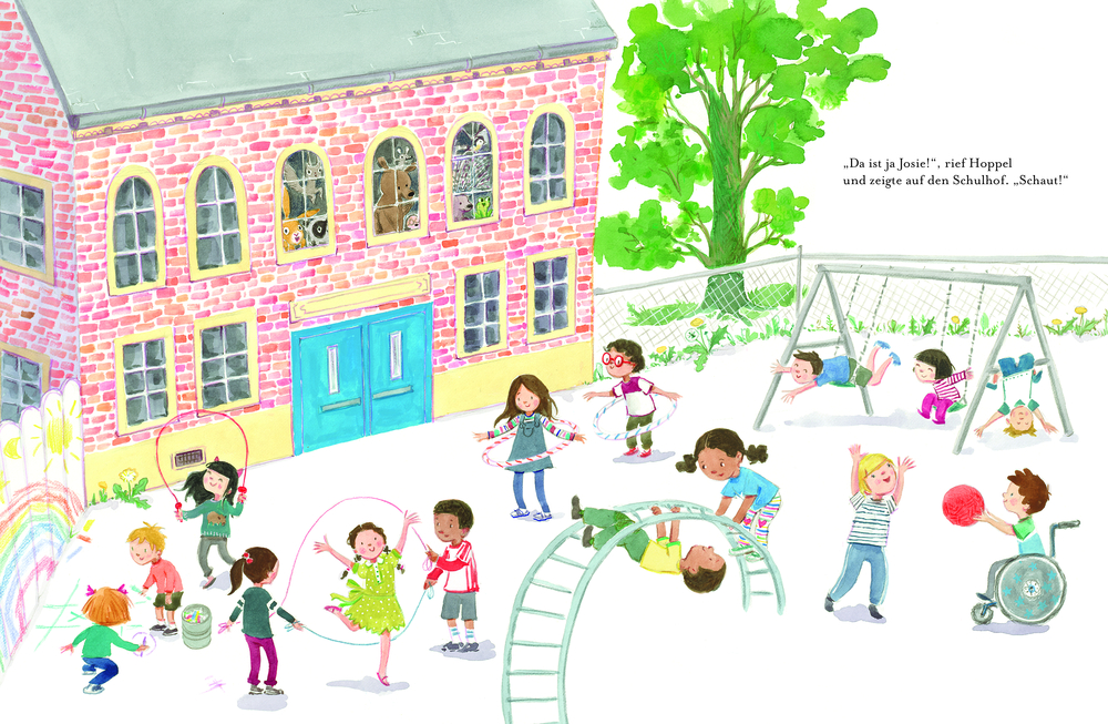 Kein Problem, denkt Hoppel: Dann kommen er, Bär, Stachelschwein, Waschbär, Eichhörnchen, Maulwurf, Vogel, Frosch und Maus einfach mit, denn wozu hat man schließlich Freunde? Doch als sie Josie am ersten Schultag begleiten wollen, verpassen sie sich leider und eine verrückte Suche quer durch die Schule beginnt. Was es dort alles zu entdecken gibt! Doch wo ist Josie?