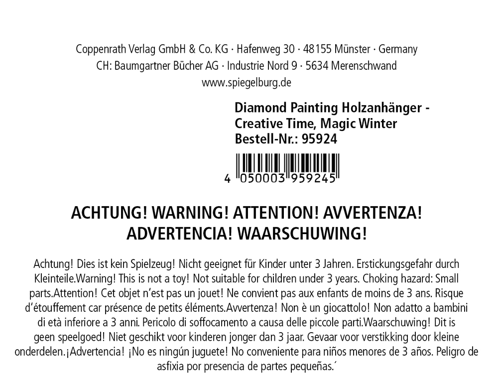- Beigaben: in bedruckter Kartonverpackung (13 x 16 x 1,5 cm) mit 2 Holzanhängern, Diamonds, Stift zum Applizieren, Behältnis und Anleitung