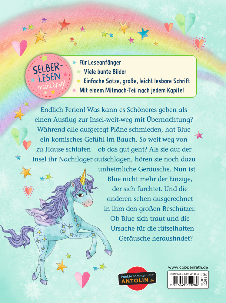 Hurra! Endlich Ferien! Was kann es da Schöneres geben als einen Ausflug zur Insel-weit-weg mit Übernachtung? Während alle anderen aufgeregt Pläne schmieden, hat Blue ein komisches Gefühl im Bauch. So weit weg von zu Hause zu schlafen – ob das gut geht? Doch als sie auf der Insel angekommen sind und ihr Nachtlager aufschlagen, hören sie plötzlich unheimliche Geräusche. Nun ist Blue nicht mehr der Einzige, der sich fürchtet. Und seine Freunde und Geschwister sehen ausgerechnet in ihm den großen Beschützer. Ob Blue sich traut und die Ursache für die rätselhaften Geräusche herausfindet?