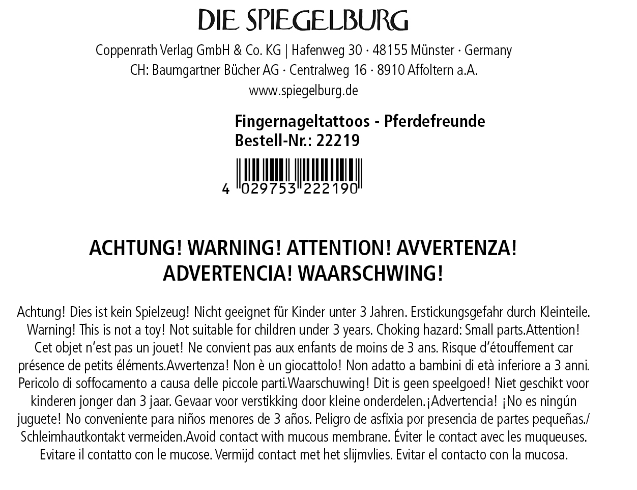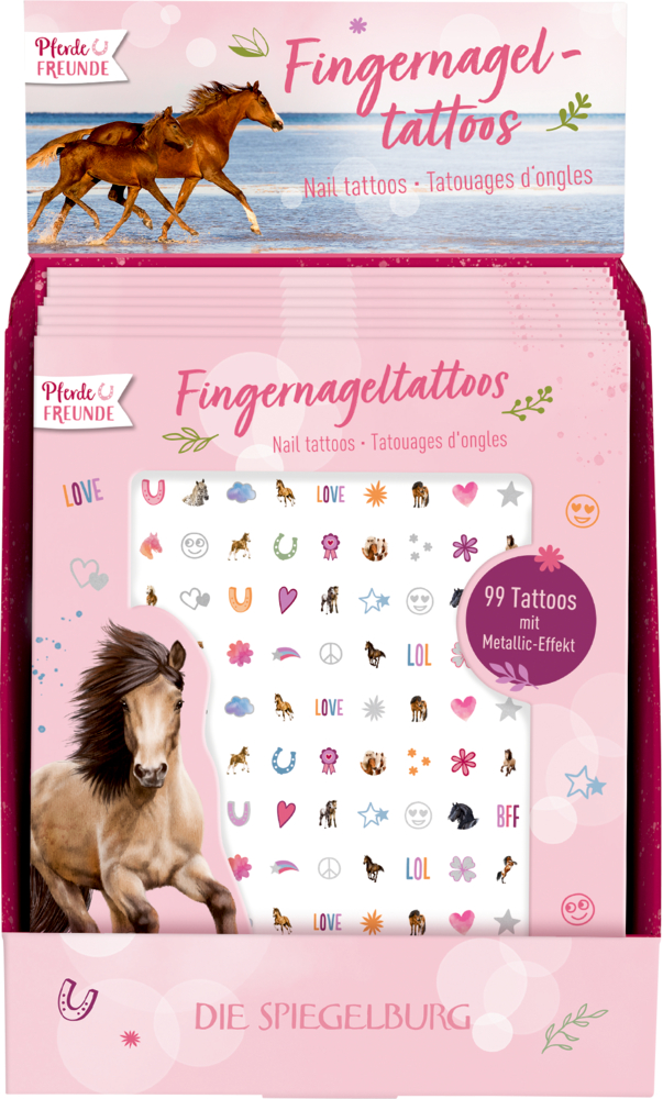 Pferdefreunde aufgepasst: Mit diesen 99 Fingernagel-Tattoos von Die Spiegelburg werden die Nägel zu einem echten Hingucker. Zauberhafte Pferde-Motive, coole Schriftzüge und einzelne Motive mit aufregendem Metallic-Effekt lassen die Nägel junger ReiterInnen strahlen und funkeln.