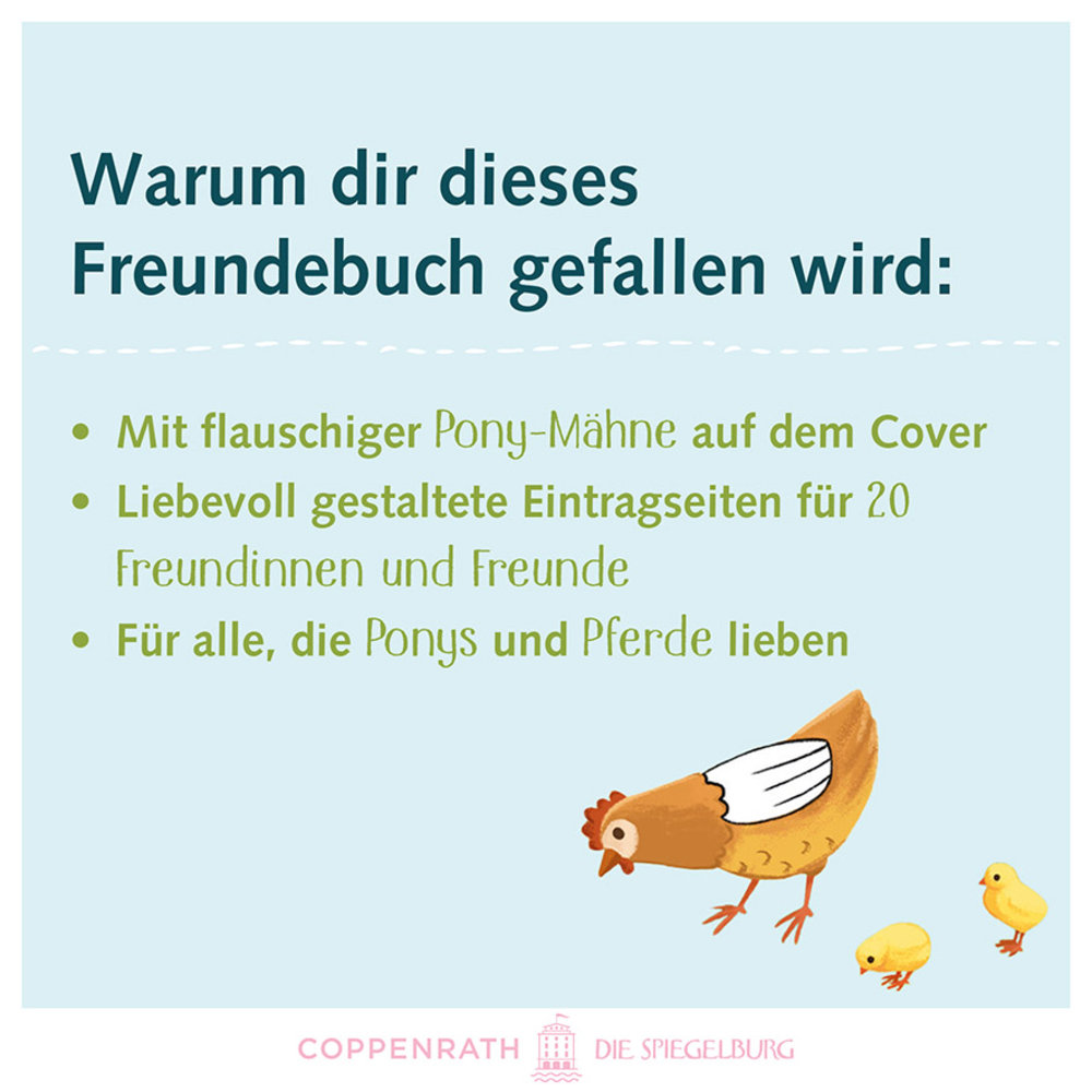 Dieses niedliche Pony-Freundebuch lässt kleine Pferdefans strahlen! Mit einer Ponymähne auf dem Cover und liebevoll illustrierten Seiten bietet es Platz für 20 Freundinnen und Freunde. Kreative Eintragmöglichkeiten zum Ankreuzen und Ausmalen machen das Freundebuch zu einer bleibenden Erinnerung an die Kindergartenzeit.