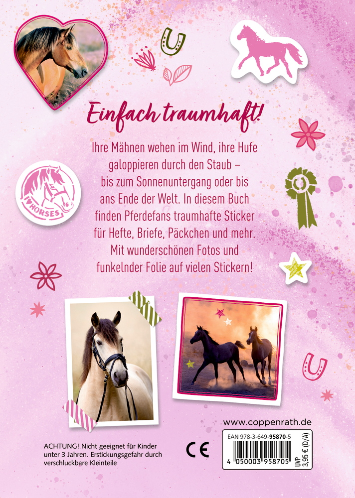 Ihre Mähnen wehen im Wind, ihre Hufe galoppieren durch den Staub – bis zum Sonnenuntergang oder bis ans Ende der Welt. In diesem Buch finden Pferdefans traumhafte Sticker für Hefte, Briefe, Päckchen und mehr. Mit vielen wunderschönen Fotos und funkelnder Folie!
