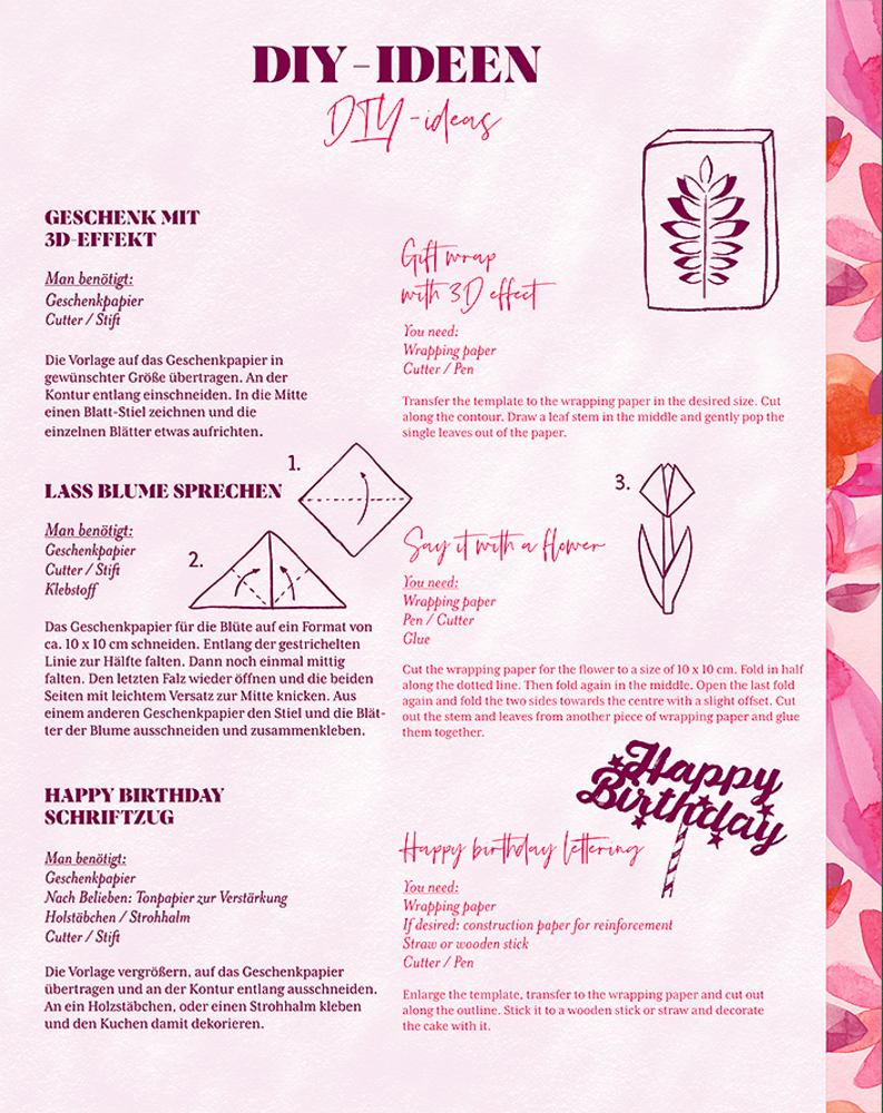 - Beigaben: 10 Geschenkpapierbögen in Broschur mit 2 Seiten DIY-Ideen und Geschenkanhängern / Boschur mit Goldfolie / Bogen: ca. 50 x 70 cm / Broschur: ca. 20 x 25 cm