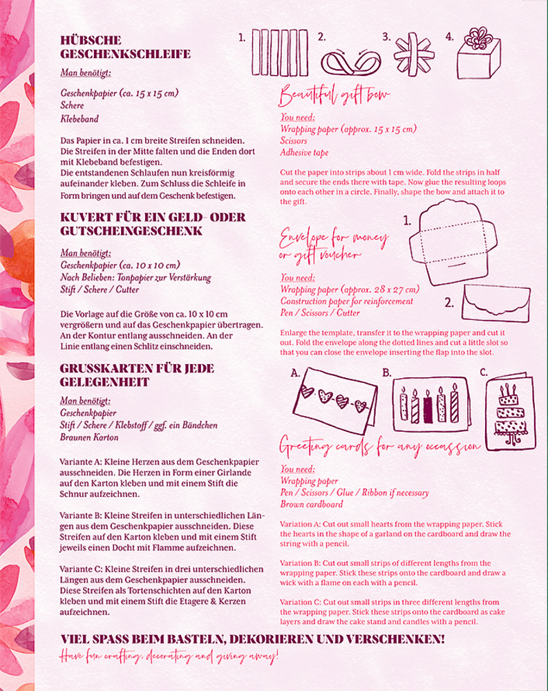 Dieses Geschenkpapierbuch aus der Serie "All about pink" beinhaltet 10 stilvoll gestaltete Geschenkpapiere für jede Gelegenheit. So wird jedes Geschenk zu einem ganz besonders liebevoll verpackten Hingucker.