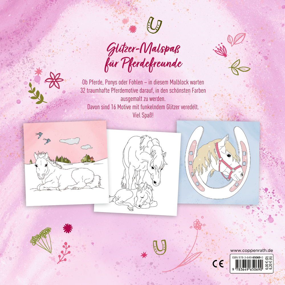 Ob Pferde, Ponys oder Fohlen – in diesem Malblock warten 32 traumhafte Pferdemotive darauf, in den schönsten Farben ausgemalt zu werden. Mit 16 bunten Glitzerseiten.