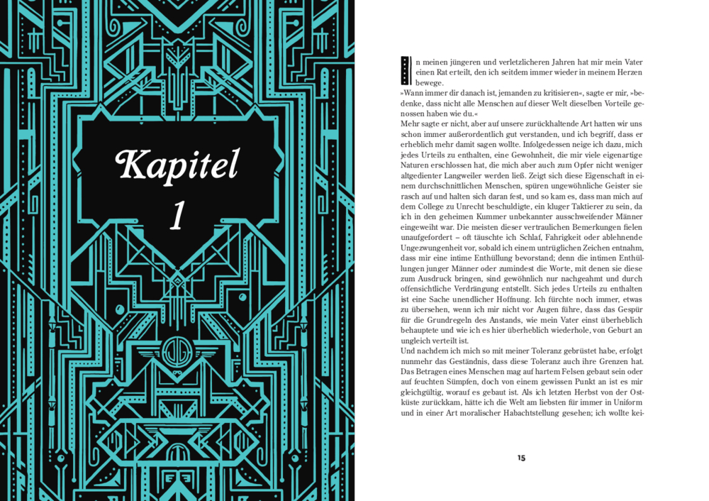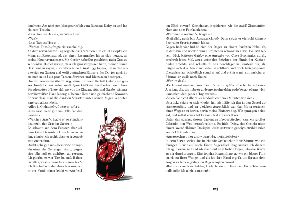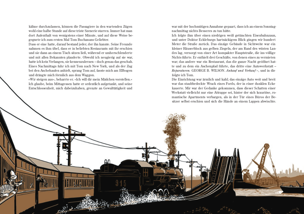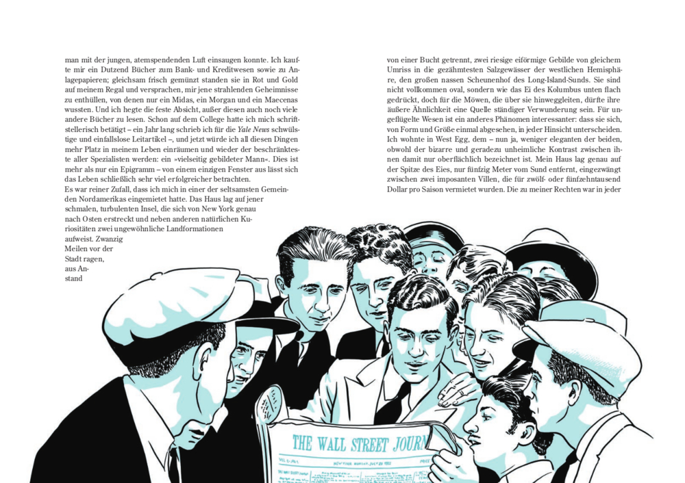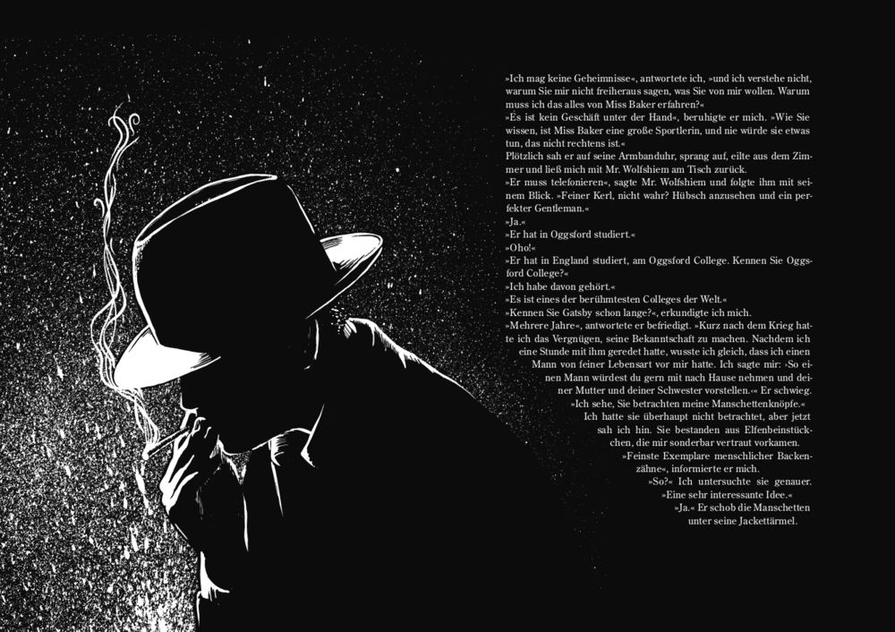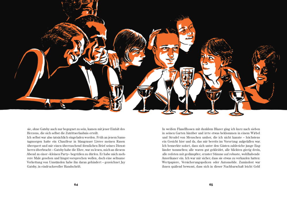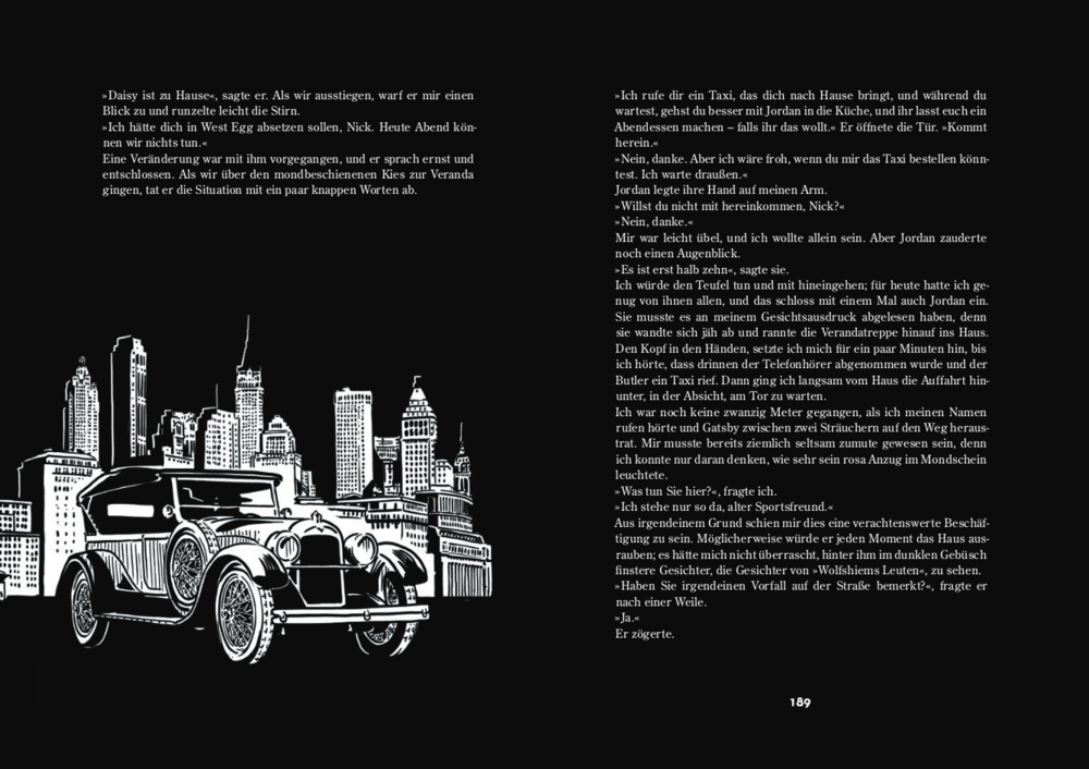 Die Zeichnungen des Buchkünstlers Robert Nippoldt machen diese Ausgabe des Klassikers zu einem ganz besonderen Schmuckstück. Eine Buchgestaltung im Stil des Art Deco, die stilgetreue Illustration – darunter zwei Panoramaformate auf Aufklappseiten – sowie 11 aufwendig gestaltete Extras lassen die einzigartige Stimmung im New York der Roaring Twenties lebendig werden: einer Zeit des wirtschaftlichen Wachstums, der ersten Wolkenkratzer, der Prohibition und der Exzesse, des berühmten Broadways und der Flapper, die sich den gesellschaftlichen Konventionen widersetzten.
