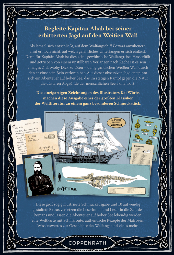 Die atemberaubend illustrierte Schmuckausgabe von Moby Dick entführt den Leser in die schicksalhafte Welt von Kapitän Ahab und seiner obsessiven Jagd auf den Weißen Wal. Kai Würbs' einzigartige Zeichnungen katapultieren die Abenteuer auf hohe See zu neuen visuellen Höhen und machen diese Ausgabe zu einem wahren Kunstwerk. Der Klappentext von Moby Dick verspricht nicht zu viel – Leserinnen und Leser werden in ein episches Abenteuer auf hoher See hineingezogen, das den stetigen Kampf gegen die Natur und die düsteren Abgründe der menschlichen Seele beleuchtet. Die lebendige Darstellung von Kapitän Ahabs fanatischer Rache und Ismaels unzähmbare Abenteuerlust fesseln die Sinne und entführen uns in eine Welt voller Dramatik und Leidenschaft. Die Ausstattung des Buches ist ebenso beeindruckend wie der Inhalt selbst. Die großzügig illustrierte Schmuckausgabe mit aufwendigen Extras wie einer Weltkarte mit Schiffsroute, authentischen Rezepten der Matrosen und interessanten Fakten zur Geschichte des Walfangs lässt den Leser tief in den Roman eintauchen. Jedes Detail, von der Silberfolie über die Hochprägung bis zum Leseband, verleiht dieser Ausgabe einen Hauch von Luxus und Einzigartigkeit. Die Gestaltung von Kai Würbs in Kombination mit der klassischen Erzählung von Herman Melville macht diese Schmuckausgabe von Moby Dick zu einem wahren Juwel in jeder Bibliothek. Ein Meisterwerk, das die Tiefe und Schönheit dieses zeitlosen Klassikers in neuem Glanz erstrahlen lässt und Leser jedes Alter verzaubert.