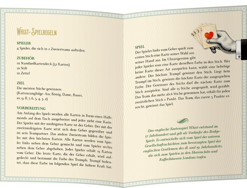 10 informative und aufwendig gestaltete Extras versetzen die Leserinnen und Leser in die Zeit des Romans und nehmen sie mit auf eine Reise in die fantastische Welt von Jules Verne: eine Weltkarte mit der Reiseroute von Phileas Fogg, spannende Informationen zum Zeitgeschehen, eine Whist-Spielanleitung und vieles mehr!