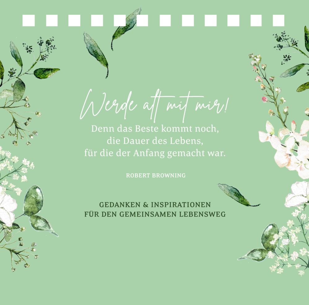 - "Werde alt mit mir! Denn das Beste kommt noch, die Dauer des Lebens, für die der Anfang gemacht war": Unter diesem Motto verbindet dieser edle Spiralaufsteller auf 176 Seiten stimmungsvolle Fotos und liebevolle Illustrationen mit inspirierenden Zitaten und Weisheiten zum Thema Liebe und Ehe, dazu gibt es Wohlfühlrezepten für Zwei. Eine wundervolle Geschenkidee für alle, die dem Brautpaar die besten Wünsche für eine glückliche Zukunft mitgeben möchten – für einen perfekten Start ins Eheglück! Hochwertig veredelt und liebevoll illustriert von Julia Borchers.