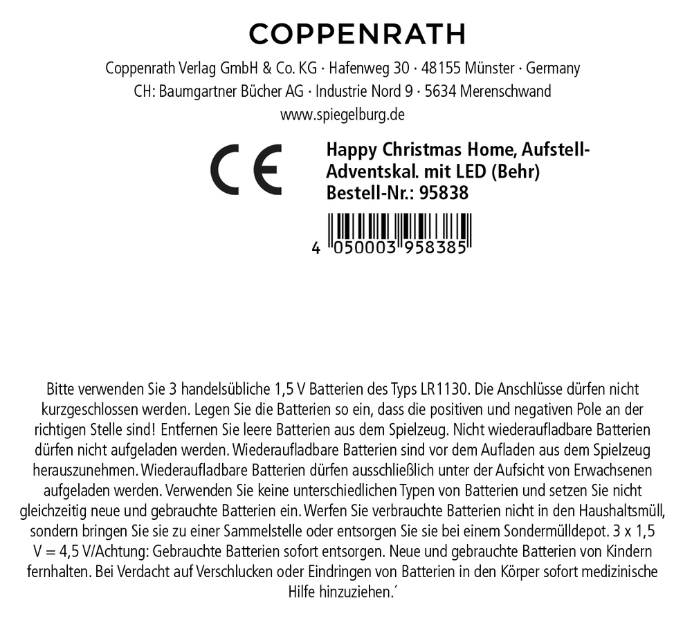 - Beigaben: Haus z. Aufstellen (18,5 x 30 x 10 cm) mit LED-Beleuchtung und austauschbaren Batterien (Knopfzellen) / Batterien im Lieferumfang enthalten / mit 24 Verwandeltürchen auf Transparentpapier, Goldfolie und Glitter / in Geschenkbox ca. 20 x 33,5 x 2 cm