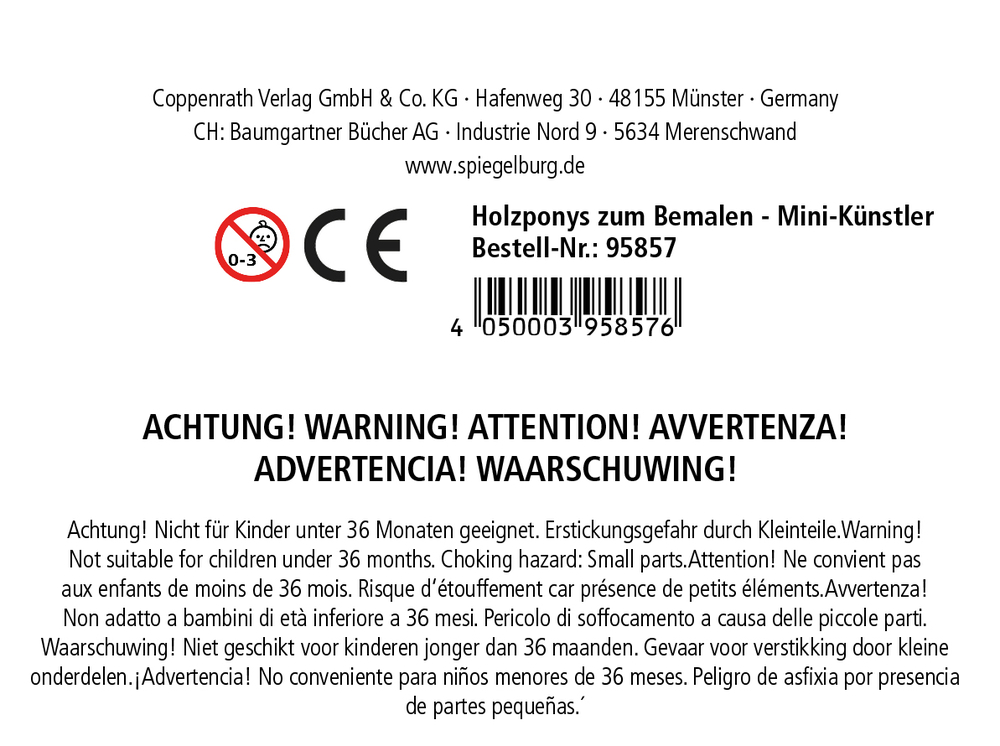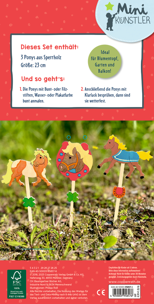 - Beigaben: Karte (14 x 27,5 cm, 4-fbg.) mit 3 verschiedenen Holzponys (22 cm, 1-fbg. bedruckt)