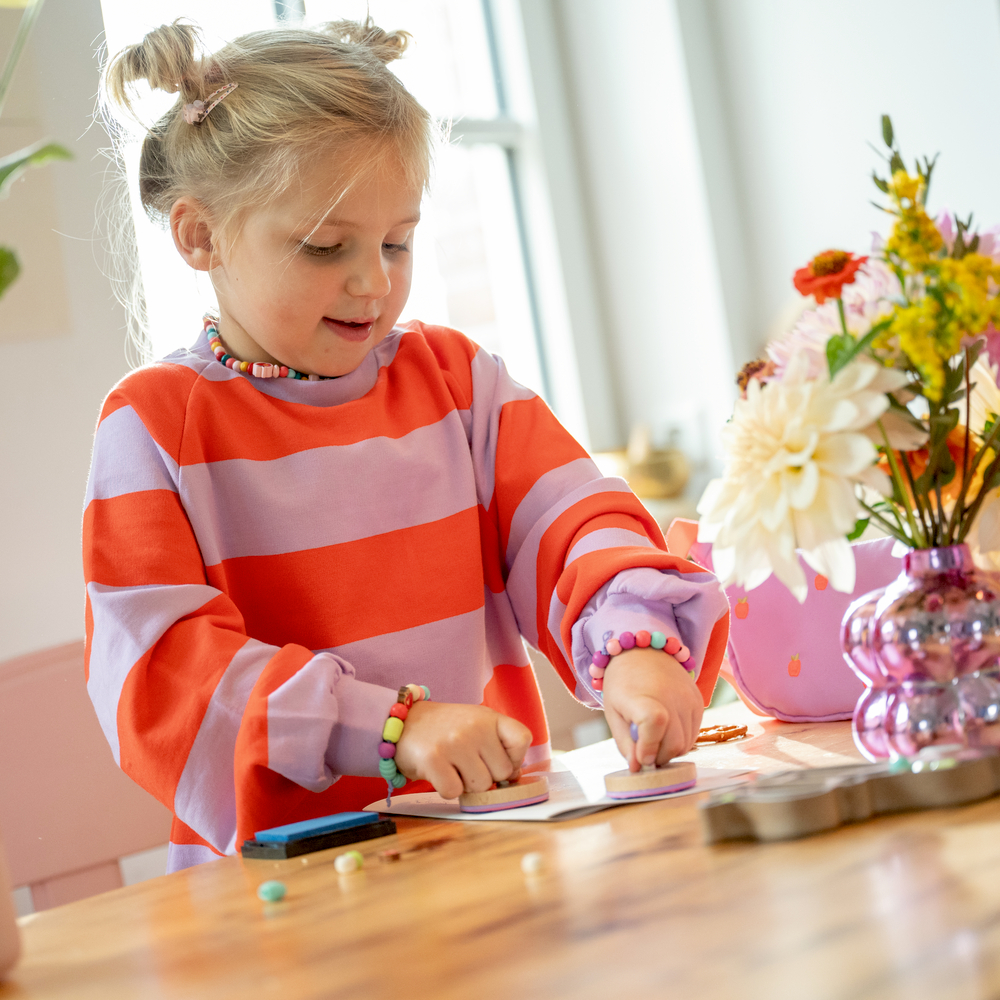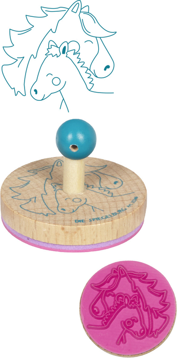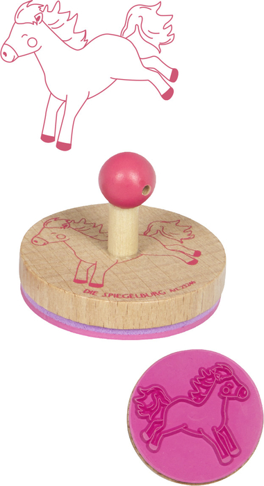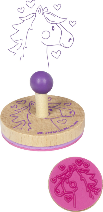 Der Holzstempel – Mein kleiner Ponyhof von Die Spiegelburg bringt Bastelspaß in fröhlichen Farben. Der bunte Knauf in Rosa, Lila oder Türkis lässt sich gut greifen. Auf der Stempelfläche wartet je ein niedliches Ponymotiv, das sich bestens zum Verschönern von Karten, Bildern und Geburtstagseinladungen eignet. Ca. 5 cm Durchmesser. In 3 Varianten erhältlich.