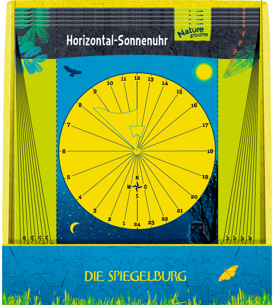 Mit dem Sonnenuhr-Bastelset von Die Spiegelburg erleben Kinder, wie Zeit mit Hilfe der Sonne sichtbar wird. Die farbig gestaltete Bastelvorlage wird einfach ausgeschnitten, gefaltet und draußen aufgestellt – schon lässt sich anhand des Schattens die Tageszeit ablesen. Eine ausführliche Anleitung erklärt Schritt für Schritt, wie die Uhr funktioniert und warum der Schatten wandert. Ca. 21 x 21 cm.