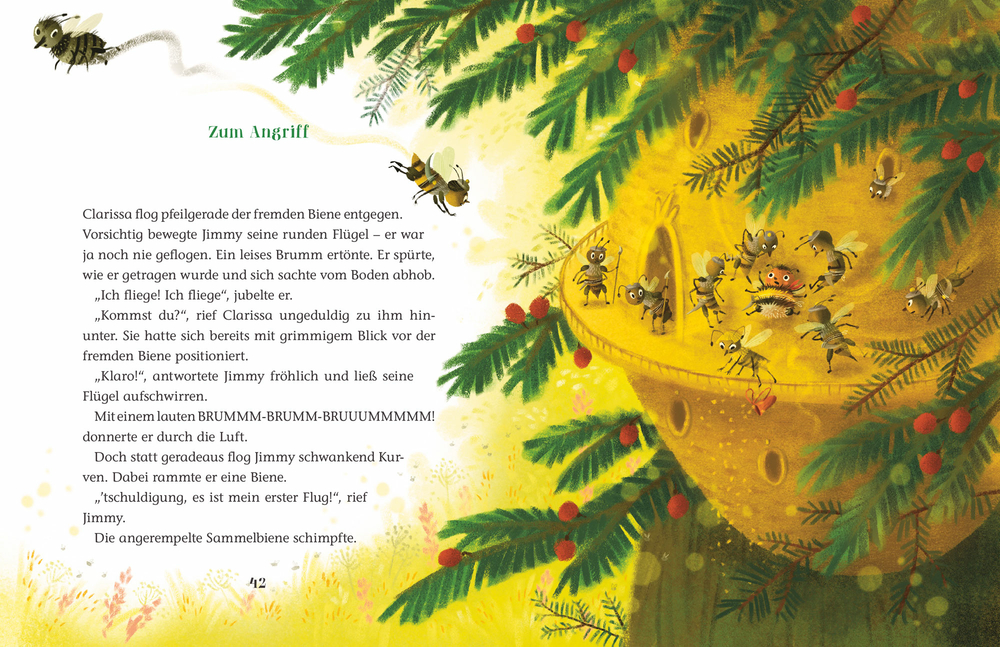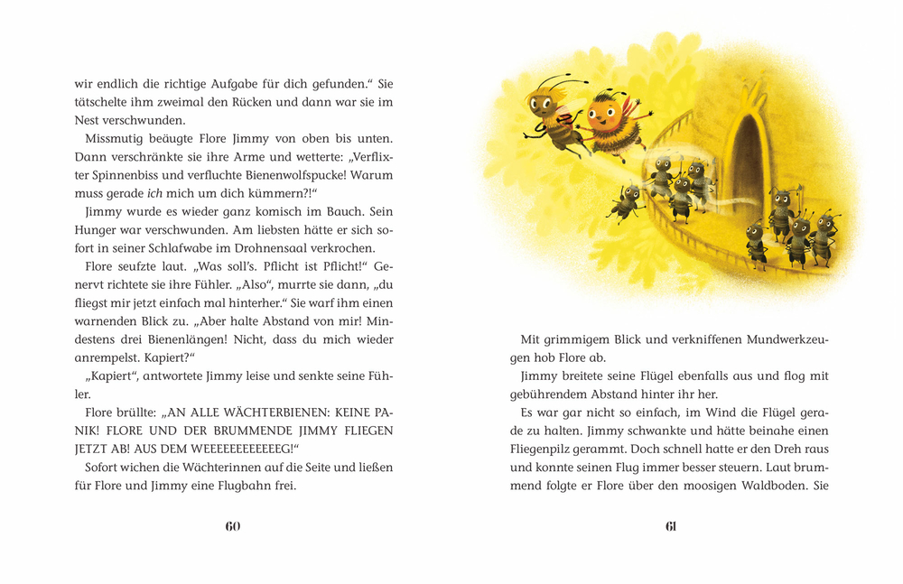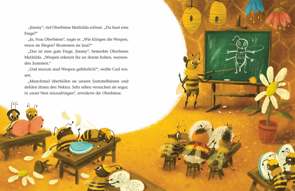 Jimmys und seine Freunde sind ganz besonders liebenswerte Brummer Gestaltung: ---------- Das Buch ist mit vielen liebevollen Zeichnungen von Jimmy und seinen Freunden gestaltet. Als Hardcover ist es sehr wertig und schön. Inhalt: ---------- Jimmys Ei wird in letzter Sekunde in einer Sturmnacht wieder zurück in den Bienenstock gebracht. Als er schlüpft, wundern sich alle, dass er viel größer und dicker ist als die anderen Bienen. Und er hat so viel Appetit! Irgendwas scheint an ihm nicht "normal" zu sein. Um für ihn eine geeignete Position im Bienenstock zu finden, teilt man ihn erst zum Putzen ein, dann für die Fütterung und schließlich als Wächterbiene. Doch bei jeder Aufgabe scheint er fehl am Platz zu sein! Bis die Sammlerin Flore auf die Idee kommt, ihn zum Pollensammeln mitzunehmen. Auf diese Weise findet Jimmy nicht nur seine Erfüllung, sondern auch Freunde, die ebenfalls alle "irgendwie anders" sind: die Anakonda Oskar, die Goldfliege Helga und der Maikäfer Bruno. Als "Club der dicken Brummer" erleben sie so manches Abenteuer, retten jemanden aus den gefährlichen Händen - pardon Flügeln - von Wespen, und nebenbei lernt Jimmy mehr darüber, wer er wirklich ist. Mein Eindruck: ---------- „He, Bienenjunge, alles in Ordnung?“, fragte Oskar und blinzelte ihm freundlich zu. „Weißt du, es ist egal, wenn man ein bisschen anders ist. Anders sein – das kann auch etwas Besonderes sein.“ Die Geschichte ist für Kinder ab 5 Jahren zum Vorlesen sehr gut geeignet, aber auch für ältere Kinder zum selber Lesen passt sie gut. Die Tatsache, "anders" zu sein und erstmal seinen Platz im Leben finden zu müssen, kennen die meisten von uns. In diesem Fall ist diese Suche nach Selbstfindung verpackt in eine warmherzig erzählte Geschichte rund um Zusammenhalt und Freundschaft, die gewürzt wurde mit spannungsvollen Momenten und auch einigen Prisen Humor. Jimmy schließt man sofort ins Herz und fiebert mit ihm mit, wenn er versucht, seine Jobs gut zu erledigen und häufig aufgrund seiner Körperstatur scheitert. Doch am Ende findet nicht nur Jimmy heraus, wer er wirklich ist, sondern hat auch viele Freunde gewonnen, die auf ihre Art anders und somit besonders liebenswert sind. Die Bezeichnung "dicke Brummer" hatte mich anfangs in die Irre geführt, denn sie bezieht sich nicht nur auf die Körperstatur. Was genau es damit auf sich hat: lest selbst! Fazit: ---------- Eine warmherzige Geschichte zum Thema Anderssein, Selbstfindung und Freundschaft mit liebevollen Illustrationen!