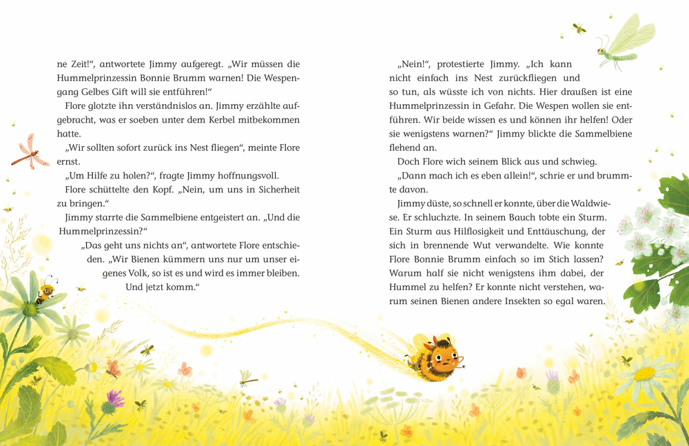 Im Bienenstock herrscht helle Aufregung. Was da aus der Bienenwabe schlüpft ist gar keine Bienenprinzessin, wie sie die erwachsenen Bienen erwartet haben. Das ist auch kein Mädchen. Da schlüpft ein pelzbehaarter, dicker Junge, dem Oberbiene Mathilda den Namen Jimmy gibt. Er so ganz anders ist als alle anderen neu geschlüpften Bienen. Jimmy wird von vielen kleinen Bienen aus dem Bienenstock gehänselt und gemobbt. Es ist auch gar nicht so einfach für ihn eine Aufgabe im Bienenstock zu finden. Aber bald bekommt er mit Maikäfer Bruno, Goldfliege Helga, Hummelprinzessin Bonnie und Regenwurm bzw. Würgeschlange Oskar richtig gute Freunde. Mit ihnen erlebt er im Wald und auf der Waldwiese so manches Abenteuer und gemeinsam versuchen sie herauszufinden, wer Jimmy wirklich ist. Autorin Barbara Rosslow hat in ihrem Kinderbuch ein wichtiges Thema abgehandelt: Anderssein und Akzeptanz. Die vielen bunten, detailreichen Bilder von Illustratorin Almud Kunert bereichern die Geschichte auf wundervolle Art. Auf dem Cover lernen wir Jimmy und seine Freunde, die hier auf einer Blüte sitzen, kennen. Auf den vorderen und hinteren Innenseiten des Buchdeckes empfängt mich eine Blumenwiese, wo mir die 5 Freunde mit ihren Namen vorgestellt werden. Die Geschichte ist spannend und sehr interessant erzählt. Jimmy und seine Freunde, einfach so liebenswerte Wesen, habe ich schnell ins Herz geschlossen. Wie nebenbei erfahre ich einiges über die verschiedenen Insekten, die Bienen, Hummeln, Maikäfer, Goldfliegen und Regenwürmer, sorry, rosa Würgeschlangen. Die Dialoge und die gereimten Liedverse lockern das Geschehen auf. Da die Geschichte in viele kleine Kapitel unterteilt ist, kann man sie auch sehr gut als Gute-Nacht-Geschichte vorlesen. Oder die geübten kleinen Leser*innen lesen sie selbst. Eine wunderbare, liebevoll gestaltete und humorvolle Geschichte mit einem Schuss Spannung über Freundschaft, anders sein, Selbstvertrauen und Zusammenhalt. Dazu bekomme ich einen Blick auf unsere Umwelt, die Natur und das Leben der Insekten. Ich empfehle das Buch, das für Kinder ab 5 Jahren geeignet ist, sehr gerne weiter.