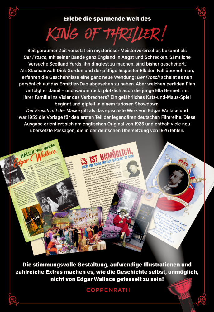 „Der Frosch mit der Maske" ist der vielleicht epischste Krimi von Edgar Wallace – und in dieser Schmuckausgabe ein echtes Highlight für alle, die Bücher nicht nur lesen, sondern erleben wollen. 11 aufwendig gestaltete Extras, die sich zwischen den Buchseiten verstecken, versetzen die Leserinnen und Leser in die Welt des Romans und lassen die Geschichte lebendig werden. Dank ihrer hochwertigen Veredelung ist diese prachtvolle Ausgabe ein echter Hingucker in jedem Buchregal und ein einzigartiges Sammlerstück!