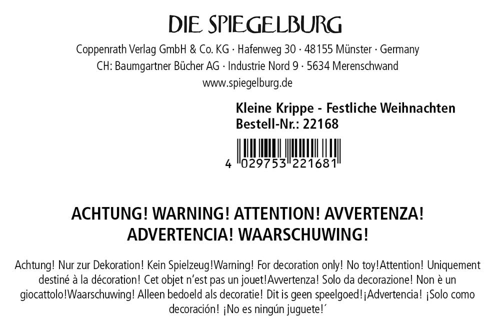 Diese kleine Krippe - Festliche Weihnachten von Die Spiegelburg bringt mit drei schlichten Porzellan-Figuren, einem Porzellan-Stern und einem minimalistischen Krippenhäuschen aus Holz besinnliche Stimmung ins Haus. Dank ihrer kompakten Größe (Haus: ca. 17 x 14,5 x 6,5 cm, Figuren: ca. 8 cm) findet sie überall einen Platz – ob auf dem Tisch, dem Kaminsims oder im Regal. Eine schöne Ergänzung der Weihnachtsdekoration und geschmackvolles Geschenk in der Weihnachtszeit.