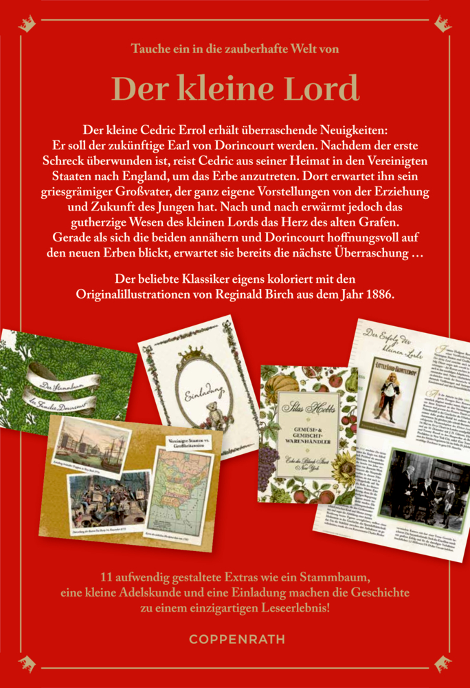Der beliebte Weihnachtsklassiker von Frances Hodgson Burnett erzählt liebevoll die Geschichte des kleinen Lord Fauntleroys, seiner Mutter und seines Großvaters. Eingerahmt von den wunderschönen Originalillustrationen von Reginald Birch aus dem Erscheinungsjahr 1886 und weiteren Stichen, ist diese prunkvolle Schmuckausgabe das perfekte Weihnachtsgeschenk. Durch die aufwendig gestalteten Extras können die Leserinnen und Leser noch tiefer in die Welt des kleinen Lords eintauchen und ihn auf seiner Reise nach England begleiten.