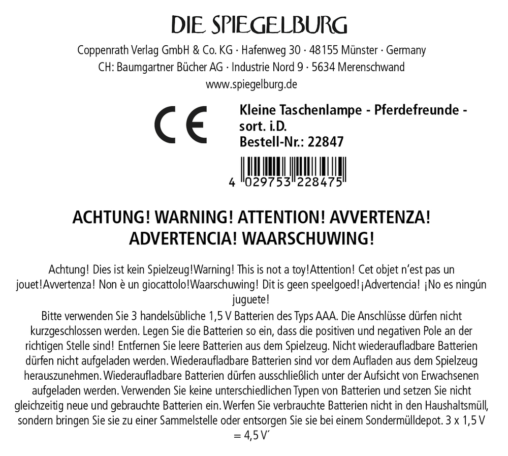 Licht für jedes Abenteuer! Die kleine Taschenlampe aus der „Pferdefreunde“-Kollektion von Die Spiegelburg bringt Licht in dunkle Stallgassen oder kuschelige Lesenischen. In zwei liebevoll gestalteten Designs sorgt sie für leuchtende Augen bei Pferdefans. Dank der ca. 9 cm Länge & Ø 3 cm passt sie in jede Tasche & die praktische Handschlaufe hält sie stets griffbereit.