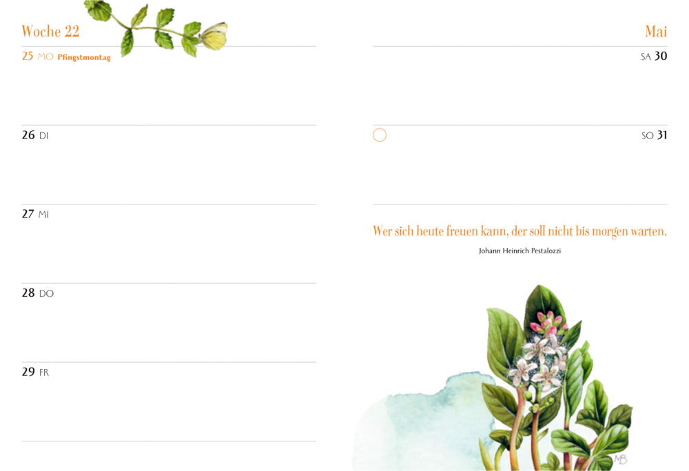 Mit den beeindruckenden und wunderschönen Illustrationen der Künstlerin Marjolein Bastin und motivierenden Zitaten wird dieser Taschenkalender zu einem besonderen Begleiter im Alltag. Auf einer Doppelseite pro Woche bleibt neben den Terminen viel Raum für wichtige Notizen und aufregende Pläne. Feiertage, Mondphasen, Sternzeichen und inspirierende Aphorismen finden ebenfalls Platz. Das perfekte Geschenk für alle, die jeden Tag im Jahr 2026 genießen möchten! Handliches Format – perfekt für unterwegs. Mit Goldfolienprägung, Leseband und Gummiband zum Verschließen.