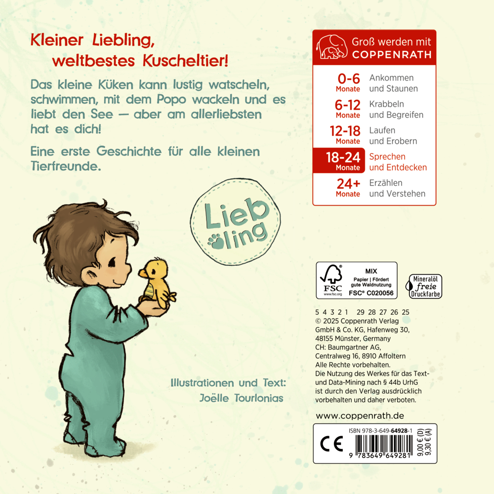 Ein besonderes Pappbilderbuch mit liebevoll gezeichneten Illustrationen von Joëlle Tourlonias und einer niedlichen Vorlesegeschichte über ein kleines Entenküken.