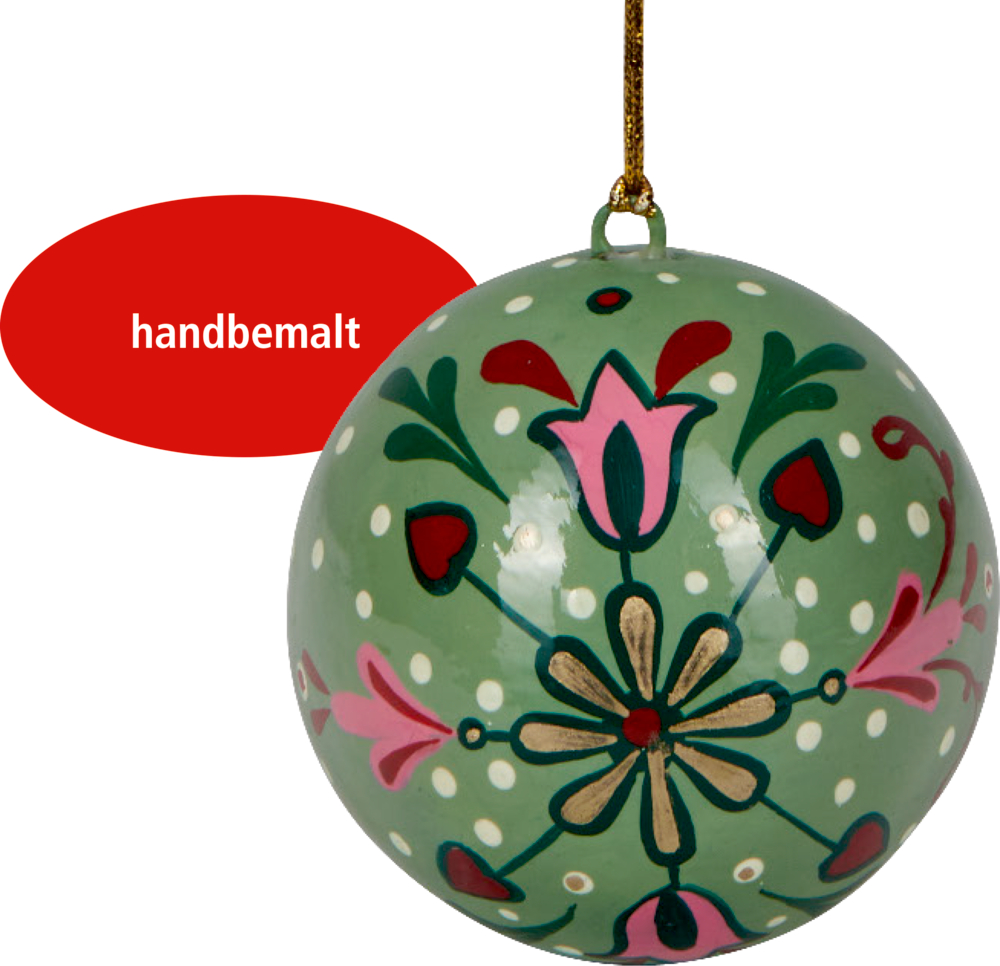 Die detailreich gestaltete Kugel aus Pappmaché von Die Spiegelburg erinnert mit ihrer kunstvollen Motivik an traditionelle Handwerkskunst. Mit einem Durchmesser von ca. 8 cm eignet sich die leichte Kugel wunderbar für den Tannenbaum, zarte Zweige oder eine festliche Tischdekorationen. Die gedeckten Farben bringen eine warme, gemütliche Note ins Wohnzimmer.