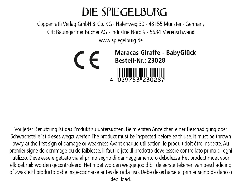 Die Maracas Giraffe - Babyglück von Die Spiegelburg bestehen aus zwei gefüllten Kugeln, die mit einem Griff verbunden sind und für Rhythmus und Spielfreude sorgen. Bei jeder Bewegung erzeugen die beiden Kugeln ein sanftes Rasseln, das Babys begeistert und spielerisch ihr Taktgefühl fördert. Das fröhliche Giraffenmotiv mit bunten Farben macht die Rassel zusätzlich zu einem süßen Blickfang. Mit ihrer Größe von ca. 14 x 5 cm liegt sie ideal in kleinen Kinderhänden und lädt zum fröhlichen Schütteln und Entdecken von Geräuschen ein.