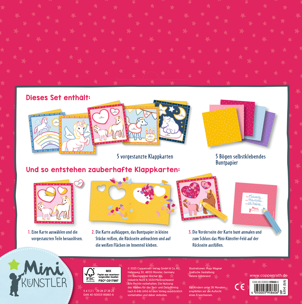 Alles-schon-drin-Set mit 5 Klappkarten und selbstklebendem Buntpapier. So entstehen tolle Bilder mit Einhorn-Motiven: