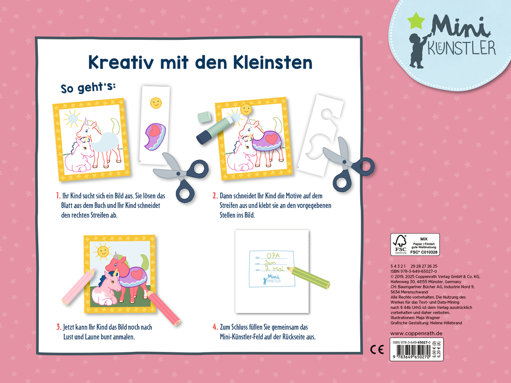 Ein Mal- und Ausschneidebuch für alle kleinen Künstler und Künstlerinnen, die Einhörner lieben. So geht's: