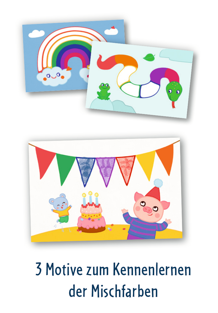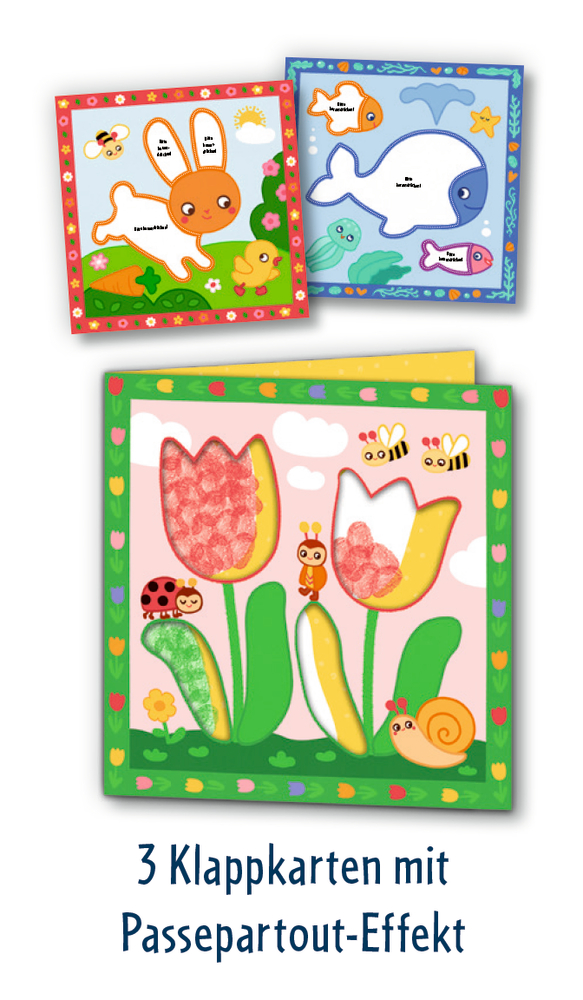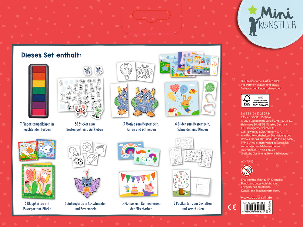 Dieses große Bastelset für Kindergartenkinder enthält 7 Fingerstempelfarben, 36 Sticker zum Bestempeln und Aufkleben, 3 Motive zum Bestempeln, Falten und Schneiden, 6 Bilder zum Bestempeln, Schneiden und Kleben, 3 Klappkarten mit Passepartout-Effekt, 6 Anhänger zum Ausschneiden und Bestempeln, 3 Motive zum Kennenlernen der Mischfarben und 5 Postkarten zum Gestalten und Verschicken.