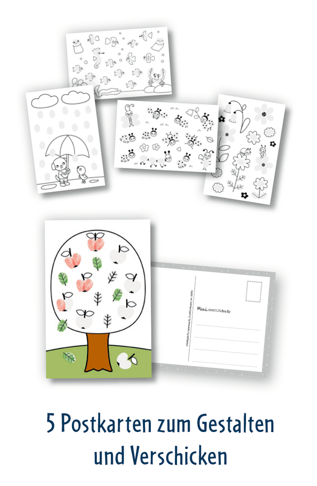 - Beigaben: in Faltschachtel (28 x 21 x 2,2 cm, 4-fbg.) mit Papiermaterialien (unterschiedliche Größen, 4-fbg.) und 7 Fingerstempel-Farben