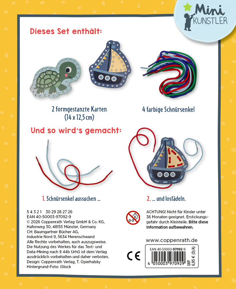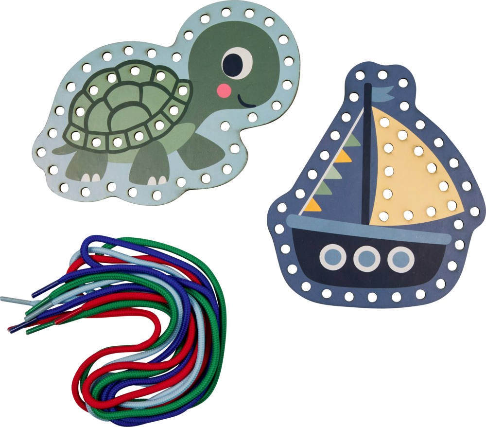 Dieses Bastelset lädt Kinder zu kreativen Stunden ein. Mit den bunten Schnürsenkeln lassen sich Schildkröte und Boot durch geschicktes Einfädeln immer wieder neu gestalten – so wird altersgerecht Kreativität wie Fingerfertigkeit gefördert. Ein kleines Set mit großer Wirkung, ideal für Kinder ab 3 Jahren als spaßige Beschäftigung für kreative Nachmittage und lustige Kindergeburtstage sowie als kleine Geschenkidee.