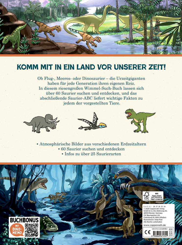 Ob Flug-, Meeres- oder Dinosaurier – die Urzeitgiganten haben für jede Generation ihren eigenen Reiz. In diesem riesengroßen Wimmel-Such-Buch lassen sich über 60 Saurier suchen und entdecken, und das abschließende Saurier-ABC liefert wichtige Fakten zu jedem der vorgestellten Tiere.