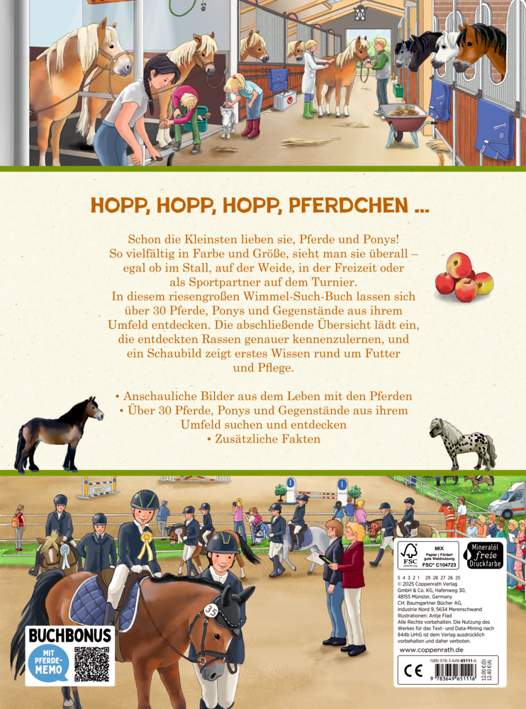 In diesem großformatigen Wimmel-SuchBuch gibt es über 30 faszinierende Einblicke in die Welt der Pferde und Ponys zu entdecken – von lebhaften Szenen im Stall bis hin zu aufregenden Turniermomenten. Mit anschaulichen Bildern, spannenden Fakten und einem interaktiven Memo-Spiel als Buchbonus per QR-Code bietet es ein unvergessliches Abenteuer für kleine Pferdefans.