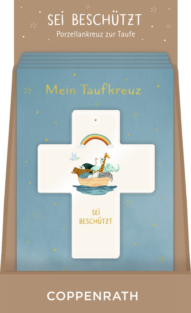 Das Taufkreuz aus Porzellan, verziert mit dem liebevollen Motiv der Arche Noah, ist ein wunderschöner Wegbegleiter für das Taufkind. Der goldene Schriftzug „Sei beschützt" symbolisiert den göttlichen Segen, der das Kind stets begleitet. Mit der praktischen Aufhängevorrichtung lässt sich das Kreuz sicher befestigen und wird so zu einer bleibenden Erinnerung an die Taufe und den Segen, der das Kind auf seinem Lebensweg begleitet.