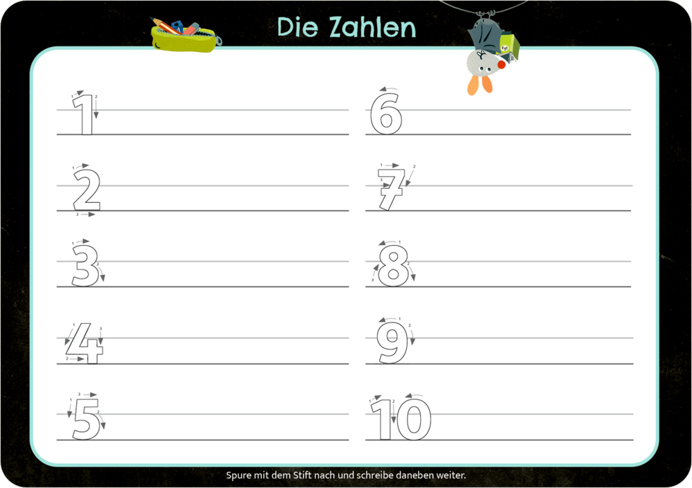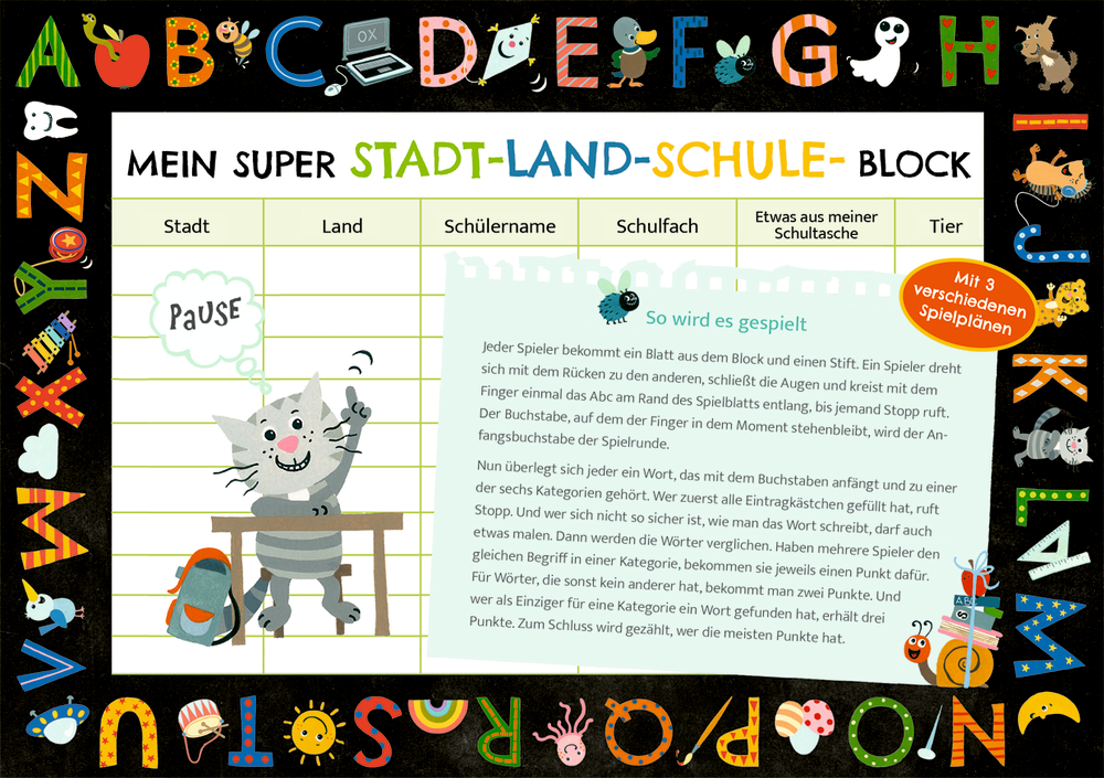 In dieser Schultaschen-Box ist jede Menge drin: Wisch-und-weg-Übungskarten zum Lernen der Buchstaben, Zahlen und der Uhrzeit, Wisch-und-weg-Übungsheft mit vielen tollen Aufgaben, Stundenplan zum immer wieder Beschriften, Wisch-und-weg-Stift, Abc-Poster für das Kinderzimmer und ein Stadt-Land-SCHULE-Spieleblock für extra Spaß in den Pausen.