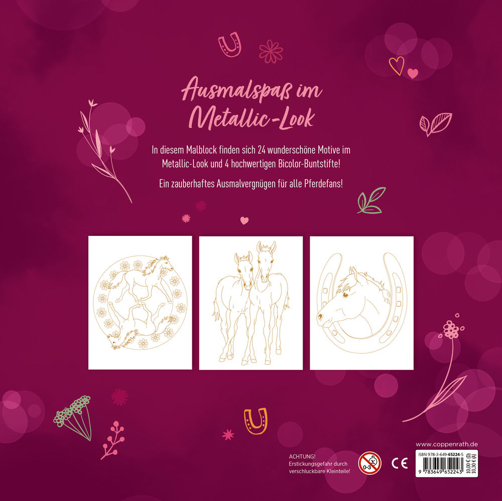 Hier funkeln nicht nur die Augen von Pferdefreunden: Der hochwertige Malblock enthält 24 wunderschöne Motive, davon 12 mit edlem Metallicfolien-Druck, sowie 4 Bicolor-Buntstifte mit 8 Metallicfarben. So kann das Ausmalen sofort beginnen – für kreativen und kindgerechten Zeitvertreib zu Hause und unterwegs. Ideal für kleine Künstlerinnen, die Metallic-Look, Fantasie und Pferde lieben – einfach auspacken und losmalen!