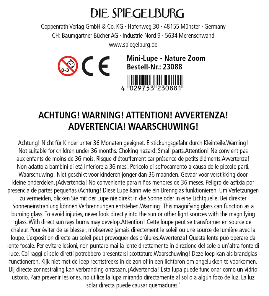 - Warnhinweis: Achtung! Diese Lupe kann wie ein Brennglas funktionieren. Um Verletzungen zu vermeiden, blicken Sie mit der Lupe nie direkt in die Sonne oder in eine Lichtquelle. Bei direkter Sonneneinstrahlung können Verbrennungen entstehen.