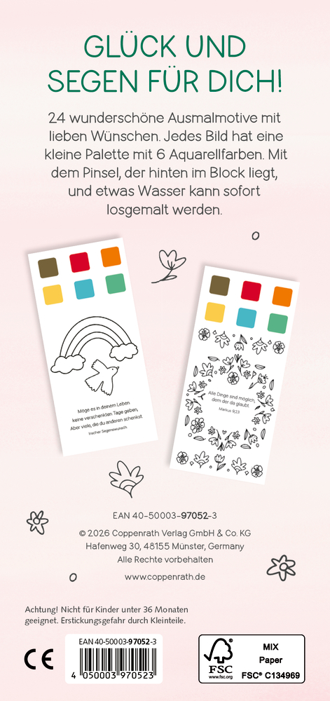 Dieser liebevoll gestaltete Mini-Malblock mit 24 Ausmalmotiven und farbenfrohen Segenswünschen lädt zu kleinen kreativen Auszeiten ein. Jedes Motiv enthält eine integrierte Palette mit 6 Aquarellfarben. Einfach etwas Wasser dazugeben und mit dem beiliegenden Pinsel direkt losmalen. Ein schönes Geschenk – zur Erstkommunion oder einfach als Mitbringsel für zwischendurch.