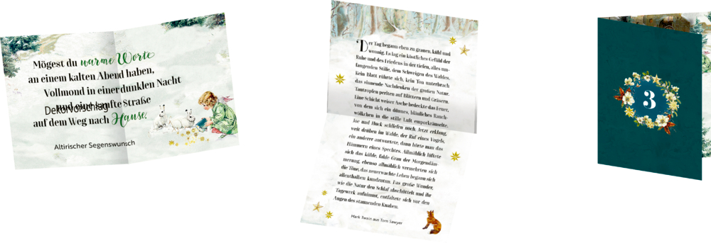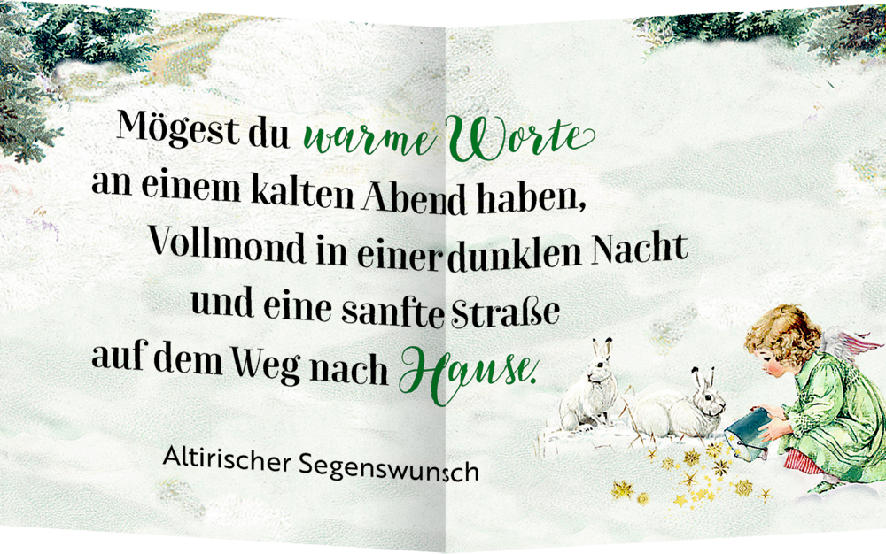 - Ausstattung: mit 24 eingeklebten Kuverts mit Briefen, Doppelkärtchen und 6 Geschenkanhängern / mit Wickelverschluss