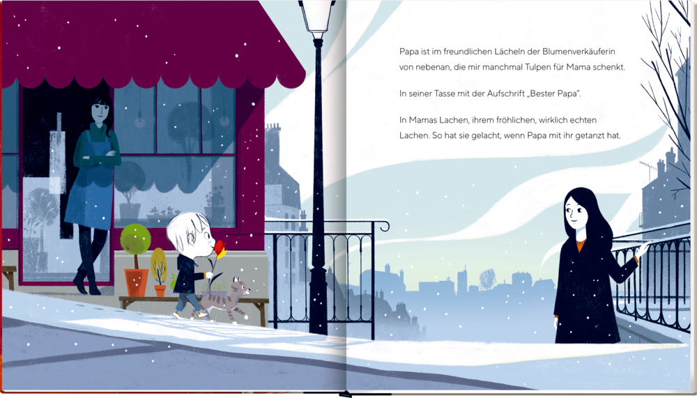 „Seit Papa nicht mehr bei uns ist, ist er einfach überall.“ So beginnt das Buch, in dem uns der kleine Junge von seinem Verlust erzählt. Er sitzt ganz klein auf einem kleinen Hügel und fast wie ein Wolke ist der Kopf seines Vater sehr groß am Himmel zu sehen. Auf einer dunkelblauen Seite sehen wir den Jungen als Dino verkleidet, das Blau symbolisiert die Tintenpfütze, die ohne Vater alles ausfüllt und Papa ist verschwunden, wie die Dinosaurier. Er findet er hat das nicht verdient und ist wütend und möchte sich am liebsten schlagen. Im Schlaf verspricht Papa „Ich bin immer in deiner Nähe.“, doch nach dem Aufwachen ist er einfach nur unglücklich, und erzählt auf, was er alles mit Papa gemacht hat. Doch dann erkennt er seinen Vater in ganz vielen alltäglichen Dingen und „im Sommer begleitet mich Papa in meinem Schatten, wohin ich gehe.“ Die Erkenntnis, dass Papa überall ist, ist ein großer Trost für den Jungen und dieser Trost kann uns alle die Trauer besser ertragen lassen. Der Verlust des geliebten Menschen macht uns immer noch traurig, aber wenn wir ihn bei uns wissen, erleichtert es uns die Trauer ein wenig. Ein wundervolles Buch für Kinder (aber auch für Erwachsene), die verstehen lernen, dass der Tod nicht bedeutet, dass dieser Mensch nicht in unseren Herzen bleibt.