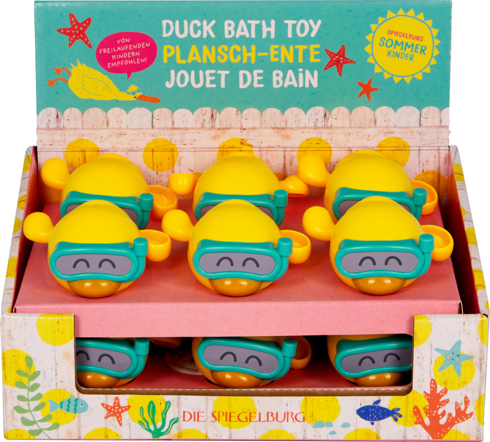 Die Plansch-Ente – Sommerkinder von Die Spiegelburg sorgt für tierischen Badespaß. Einfach die Ente am kleinen Rädchen aufziehen, ins Wasser setzen – und schon paddelt sie fröhlich drauflos! Mit ihrer knallgelben Farbe und der lustigen Taucherbrille leistet sie kleinen Wasserratten Gesellschaft in der Badewanne oder im Planschbecken. Die Ente ist ca. 8,5 x 5 x 9 cm groß.