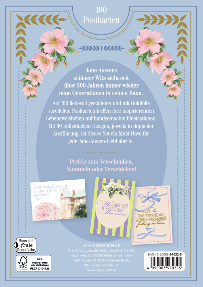 Sorgfältig ausgewählt aus ihrem literarischen Werk und ihrer persönlichen Korrespondenz entfaltet sich in den 50 englischen Originalzitaten der unverwechselbare Charme und zeitlose Witz der beliebten Schriftstellerin. Romantisch illustriert von Marjolein Bastin und verpackt in einer stilvollen und reich veredelten Schmuckschachtel, ist dieses Set mit insgesamt 100 Postkarten (jedes Design ist in doppelter Ausführung enthalten) ein Must-Have für jede Jane-Austen-Liebhaberin.