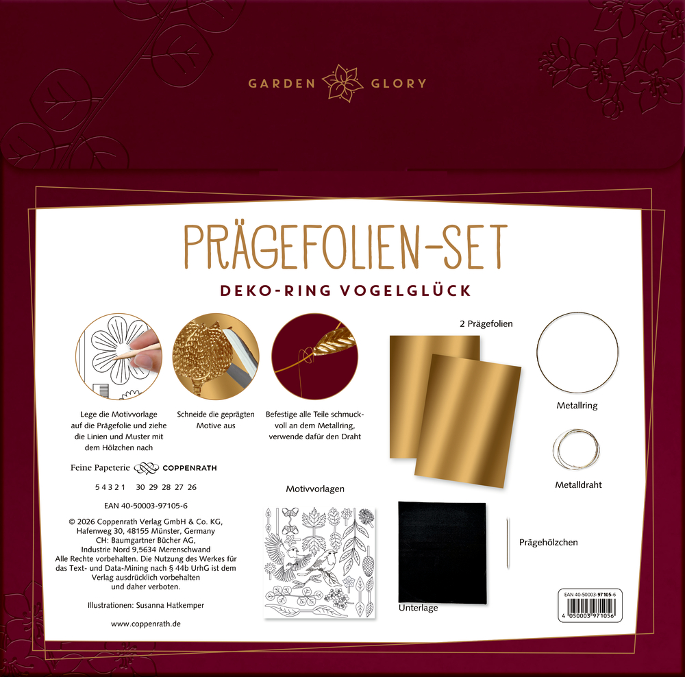 - Beigaben: in Pappumschlag (25,5 x 25,5 x 0,5 cm, 4-fbg.) mit Goldfolie und Spotlack / mit 2 Prägefolien, 1 Metallring, 1 Präge-Tool aus Holz, 1 Moosgummi-Unterlage, Befestigungsdraht und Motivvorlagen