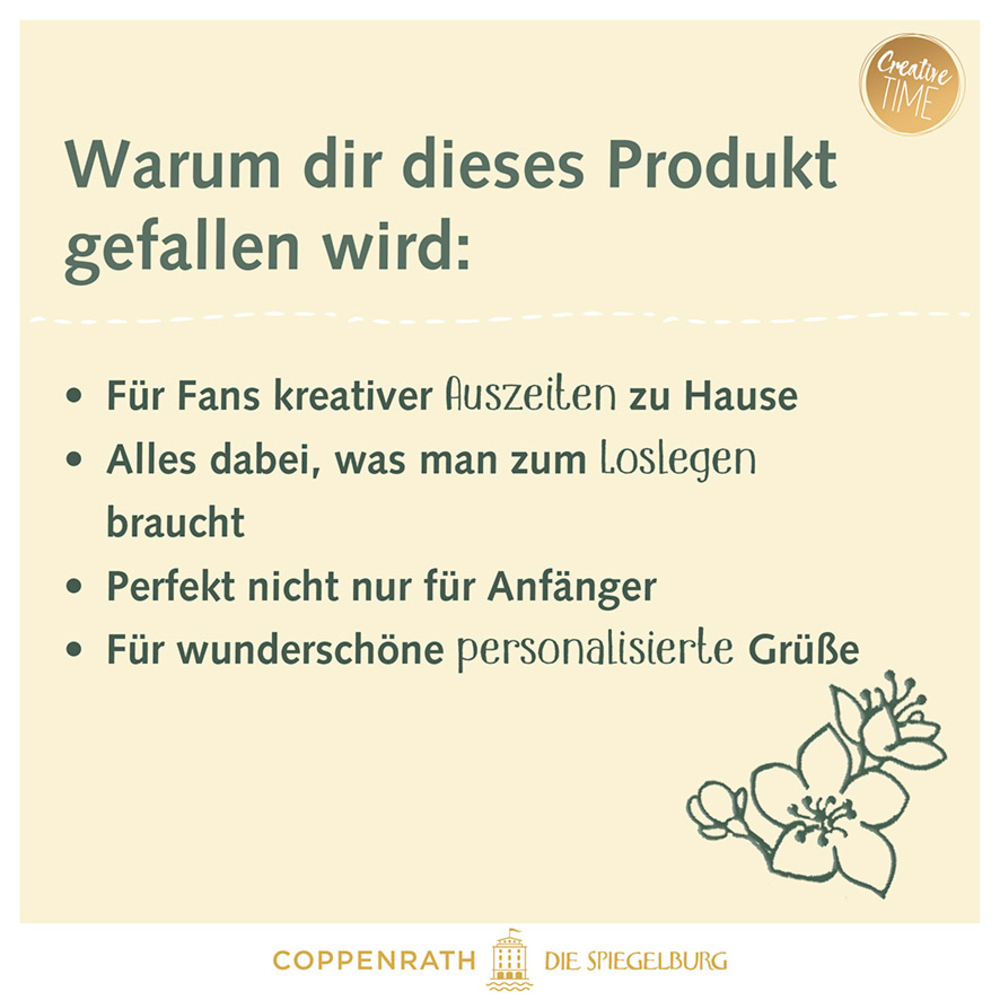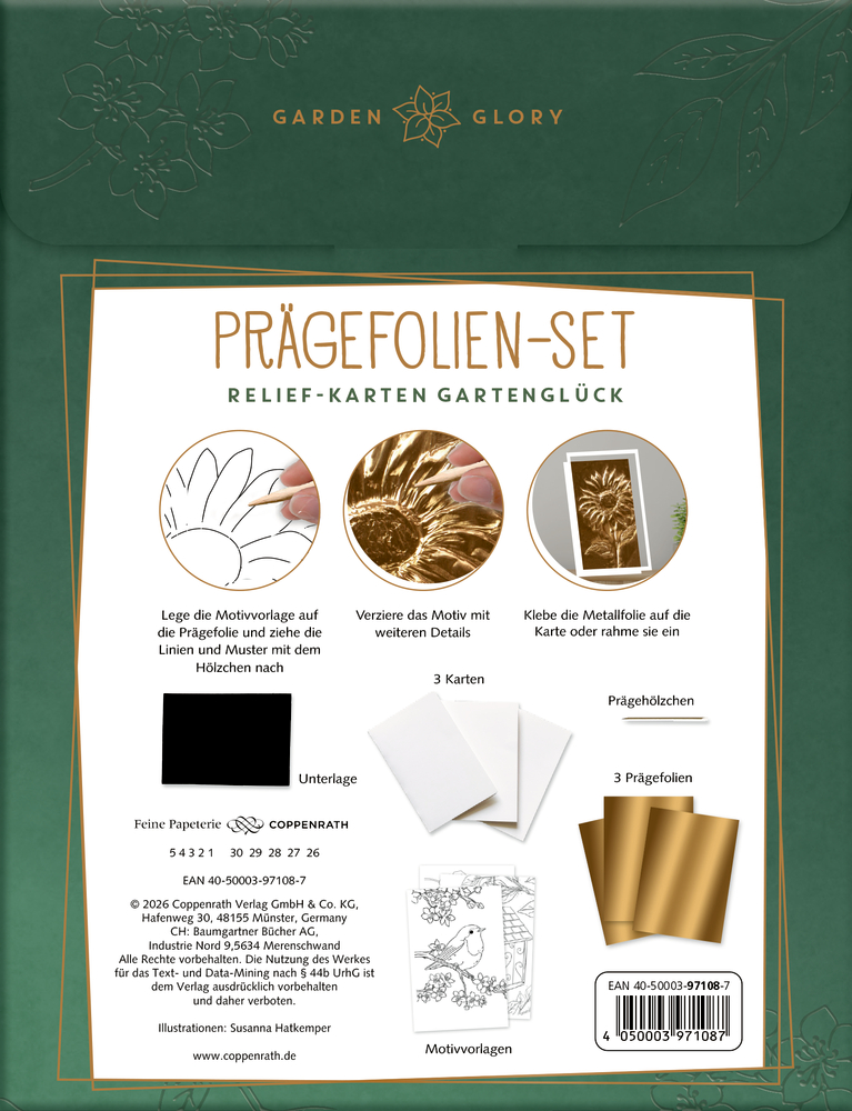 - Beigaben: in Pappumschlag (18 x 13 x 0,5 cm, 4-fbg.) mit Goldfolie und Spotlack / mit 3 Prägefolien, 3 Karten, 1 Präge-Tool aus Holz, 1 Moosgummi-Unterlage und Motivvorlagen